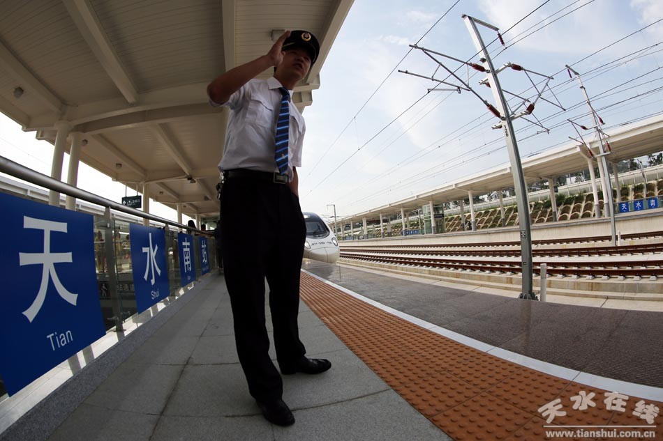(天水南站站長(zhǎng)谷江梅報(bào)告:“天水號(hào)”動(dòng)車發(fā)車準(zhǔn)備完畢。)