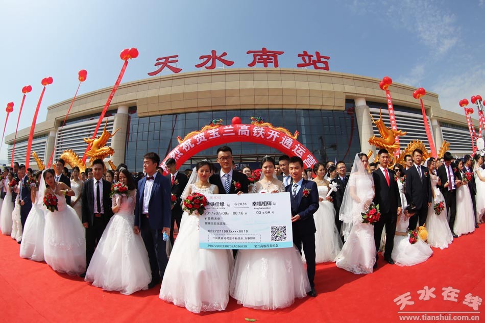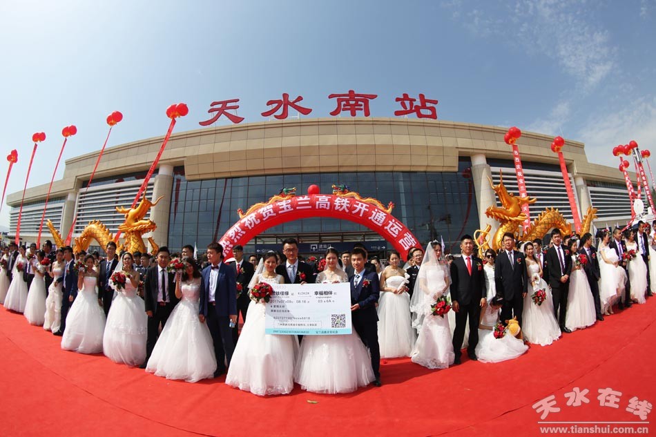 (應(yīng)天水在線邀請,在天水在線的組織下,百對新人在天水南站合影留念。)