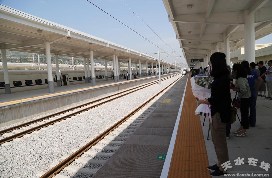 (上午9時(shí)50分,天水在線小編在1號站臺迎接從蘭州開過來的D2654次動車。)