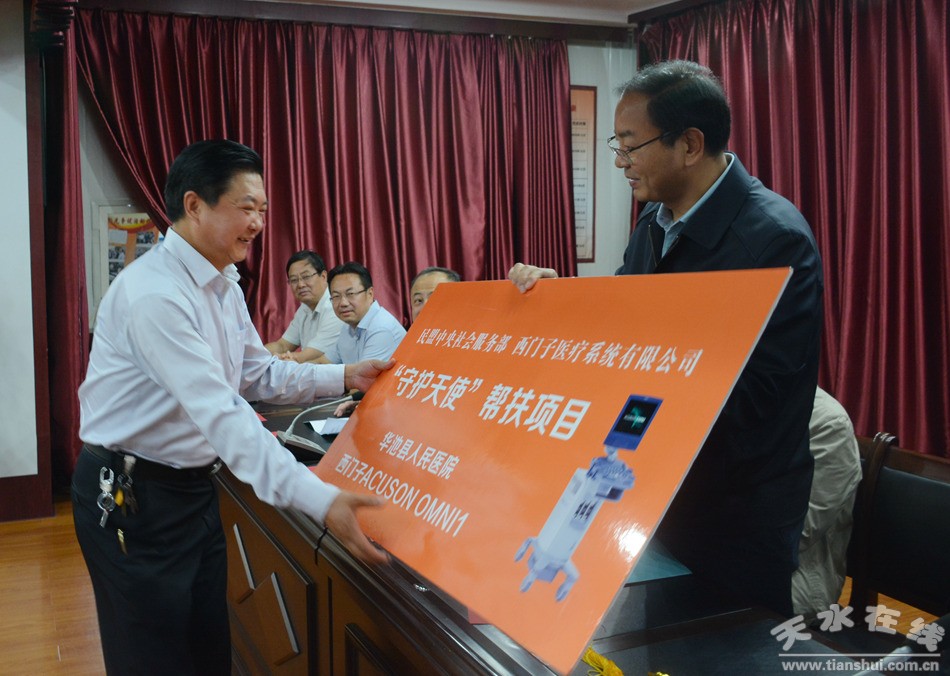 啟動儀式上,西門子醫(yī)療系統(tǒng)有限公司向秦安縣人民醫(yī)院、慶陽市華池縣人民醫(yī)院、隴南市文縣第一人民醫(yī)院等六家醫(yī)院捐贈了醫(yī)療設(shè)備,張世珍向西門子醫(yī)療系統(tǒng)有限公司頒發(fā)了錦旗。啟動儀式結(jié)束后,參加民盟中央“守護(hù)天使工程”啟動儀式的各位領(lǐng)導(dǎo)、醫(yī)療專家還參觀了秦安縣人民醫(yī)院。