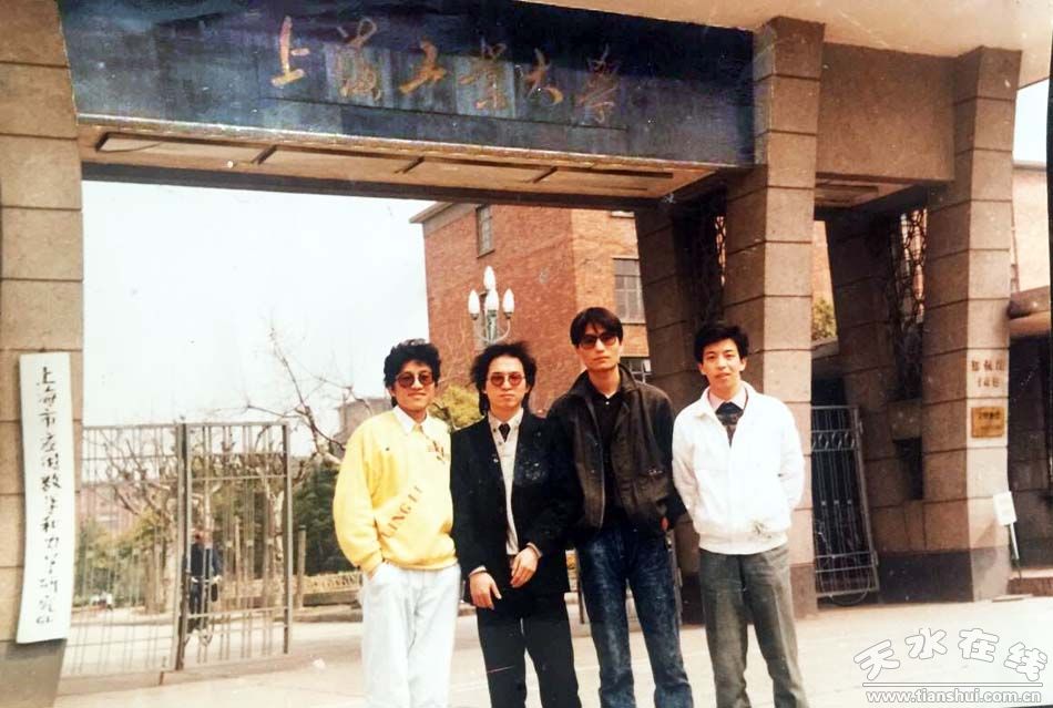 (圖中左一為筆者和大學(xué)同學(xué)于1990年在上海工業(yè)大學(xué)校門口留影。)