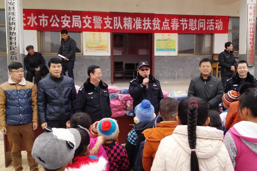 1月23日,天水市公安局交警支隊副支隊長李靜宏帶領(lǐng)支隊機關(guān)相關(guān)部門幫扶民警會同秦安縣蓮花鎮(zhèn)黨委書記、好地村書記以及駐村民警,深入支隊精準(zhǔn)扶貧幫扶點——秦安縣蓮花鎮(zhèn)好地村,在開展精準(zhǔn)扶貧對口幫扶工作的同時,進村入戶開展春節(jié)前慰問活動。