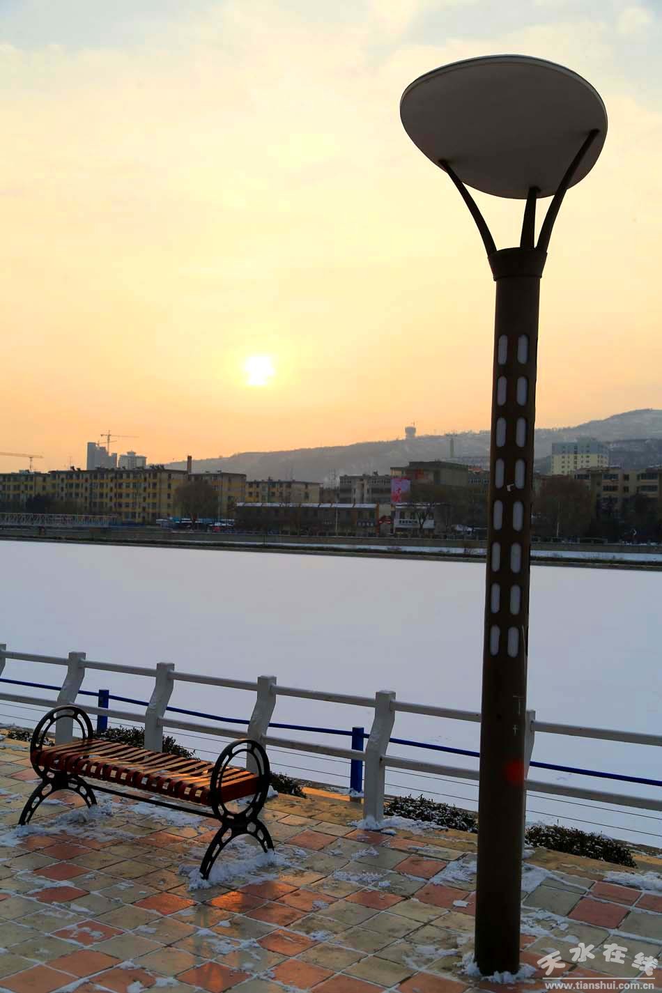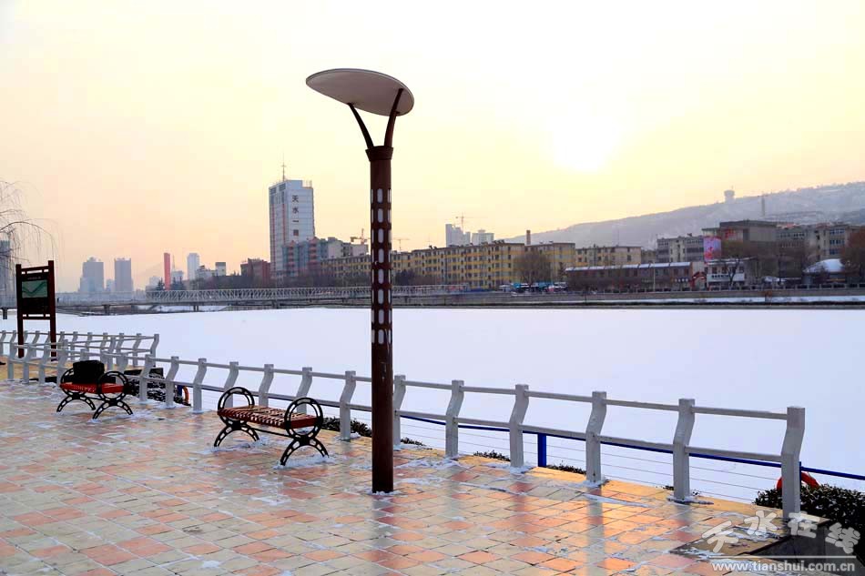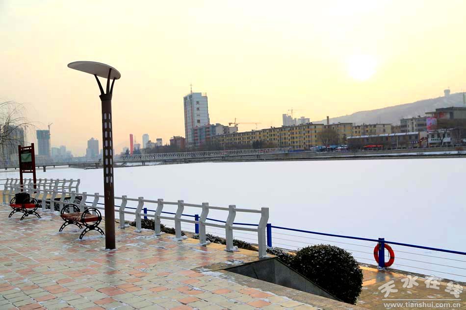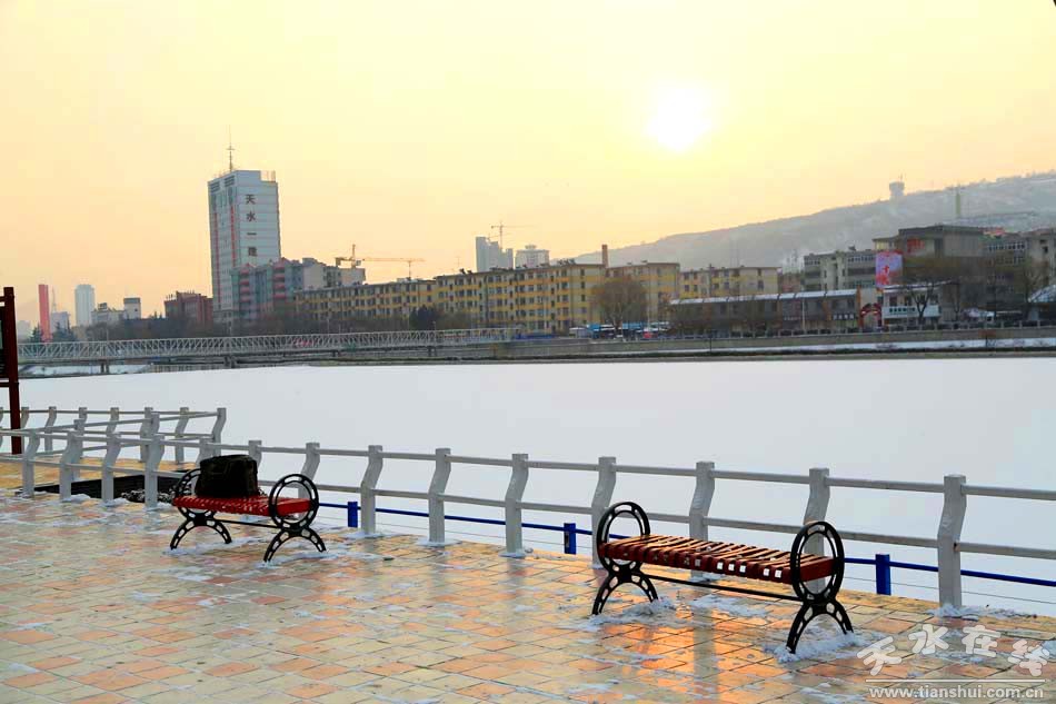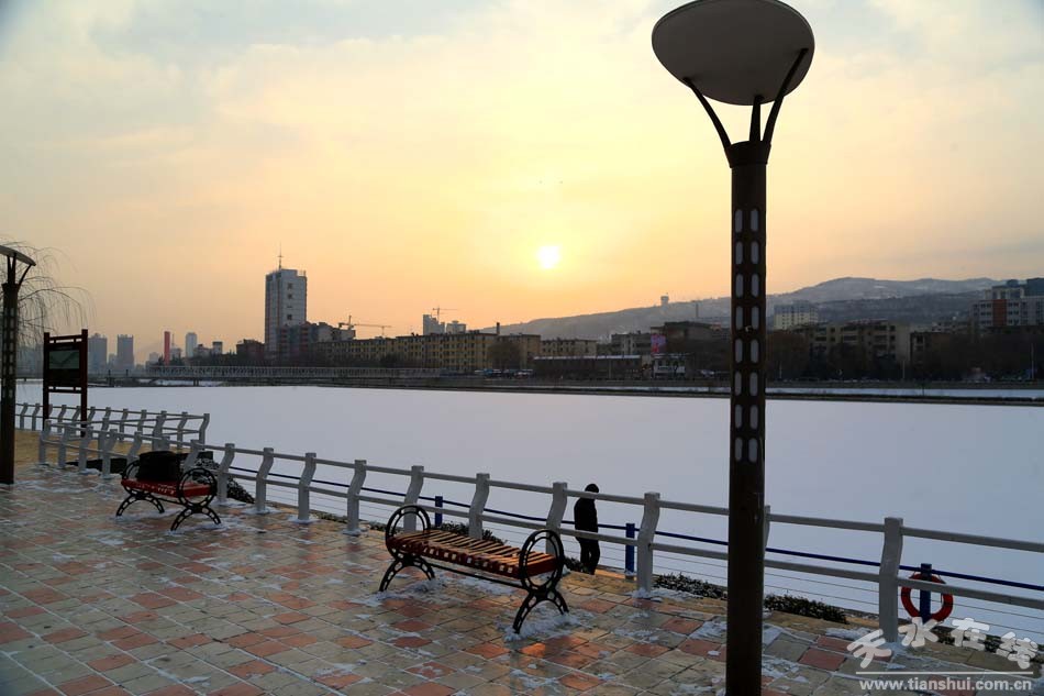 暖黃的天空與白色的湖面相映,三兩的行人與小路上獨立的長椅,也在雪后的湖邊變成了風景。文藝的天水小城,讓路人不禁沉吟,你慢些走,讓我再看看,今晨的雪后旭日,在天水湖邊漫步停留!