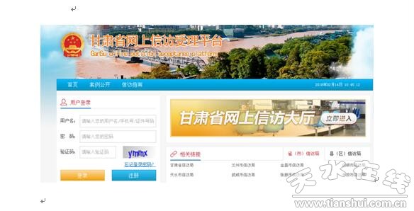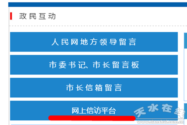 或登錄天水市人民政府網(wǎng)站:<http://www.tianshui.gov.cn/>,政民互動模塊下“網(wǎng)上信訪平臺”(如下圖)
