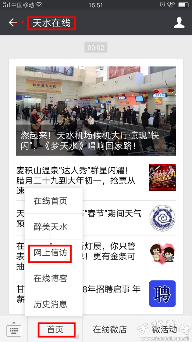 1.關(guān)注咱天水老百姓自己的公眾號“天水在線”,在“首頁”菜單找“網(wǎng)上信訪”欄目實名注冊,反映訴求。