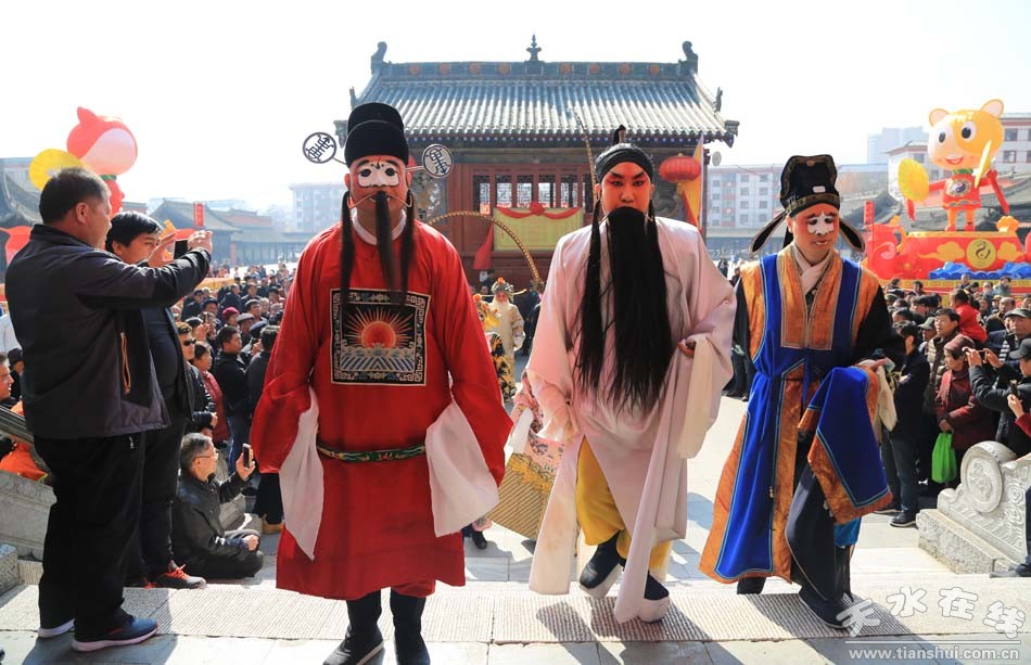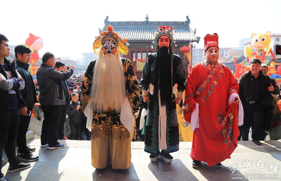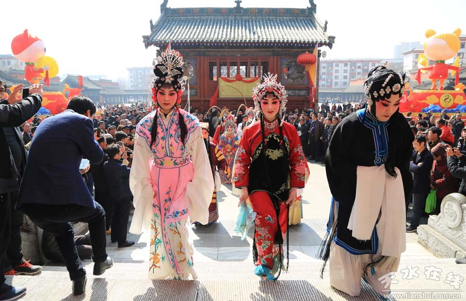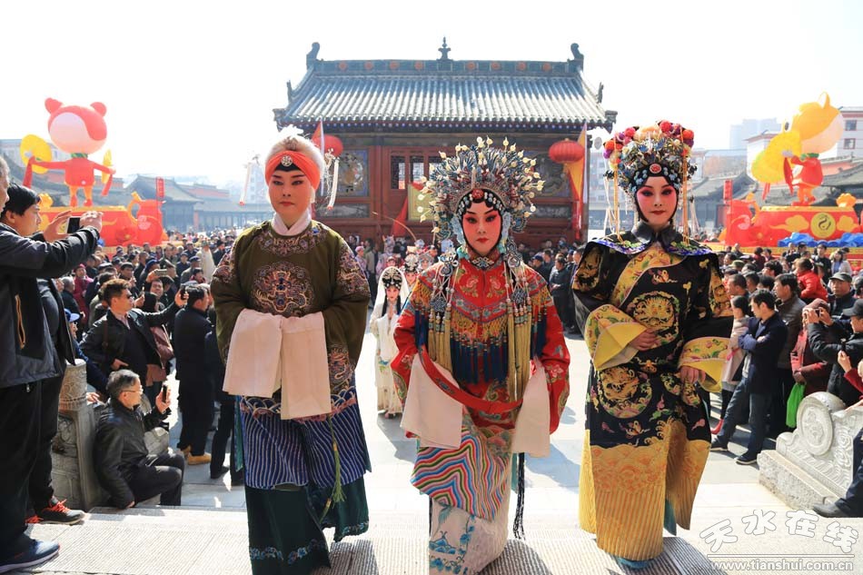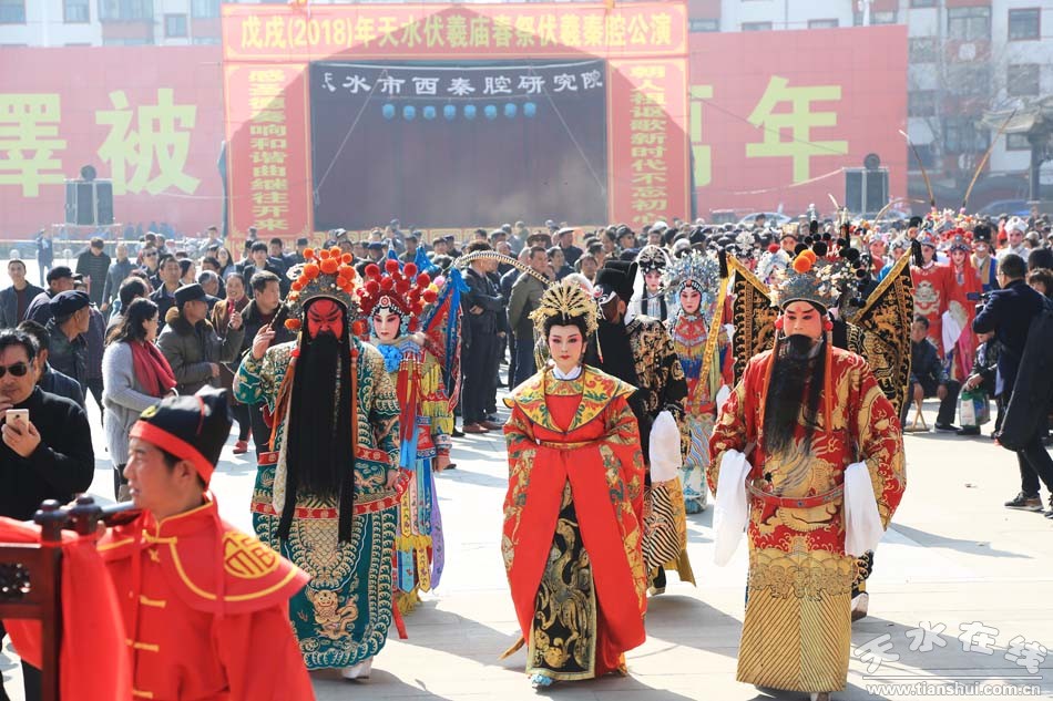2月28日,農(nóng)歷正月十三,天水市西秦腔研究院(天水市秦劇團)全體人員走進伏羲廟舉行戊戌(2018)年伏羲廟會開戲祭拜伏羲儀式。全體演出人員各自裝扮成秦腔劇目《麥積圣歌》乙弗氏,《龍鳳呈祥》劉備,《穆柯寨》穆桂英,《出五關(guān)》關(guān)公和張飛,《黃河陣》三霄娘娘 ,《五典坡》王寶釧,《鍘美案》秦香蓮、包公、韓琦、門官、公主等, 《法門寺》趙廉、孫玉姣、宋巧,《游龜山》田夫人、田玉川,《白逼宮》漢獻帝,《趙氏孤兒》趙盾,《游西湖》裴生,《斷橋》白素貞,《哪吒鬧海》哪吒,《小宴》呂布,《大升官》徐彥昭等角色,由天水市西秦腔研究院副院長袁丫丫帶領(lǐng),走進伏羲廟舉行祭拜伏羲儀式。下午二時,由天水市西秦腔研究院(天水市秦劇團)承擔的伏羲廟會大戲鳴鑼開演。