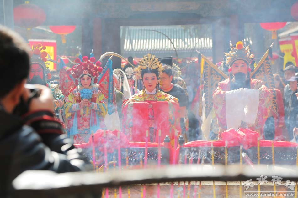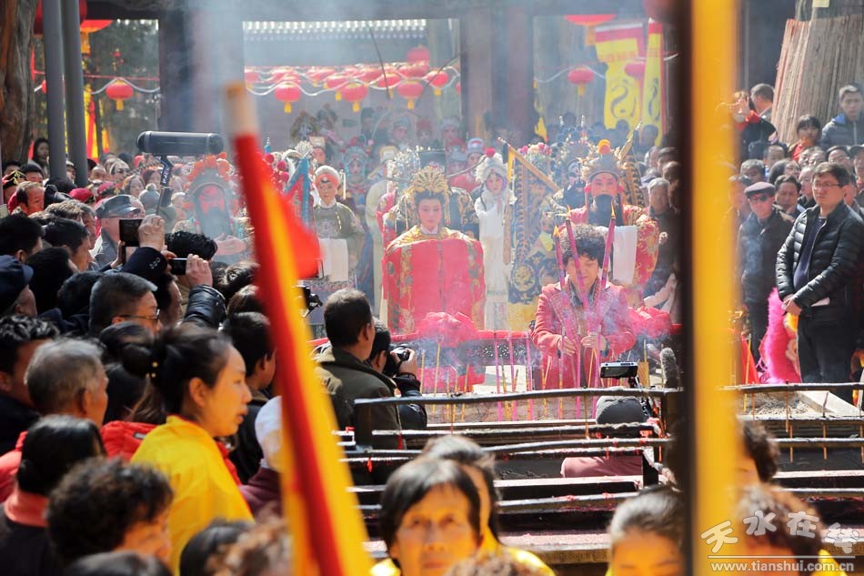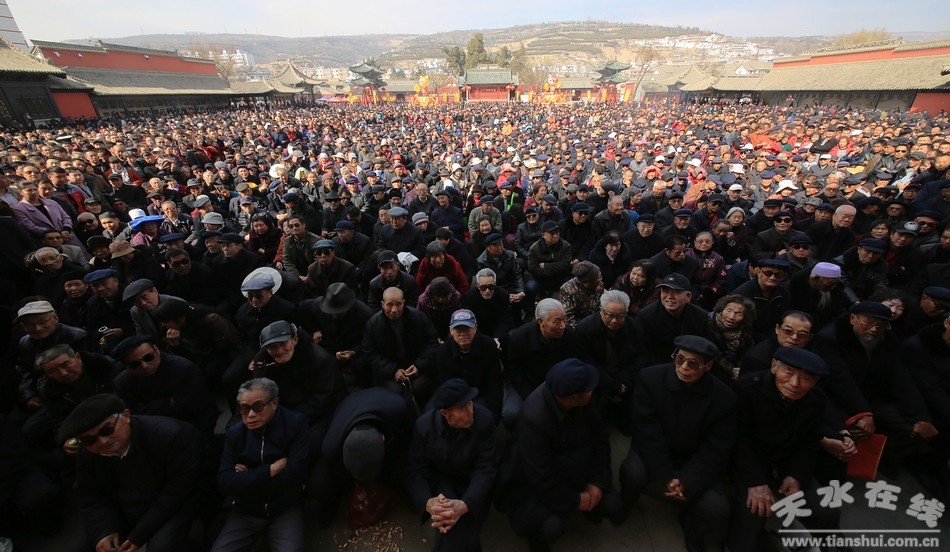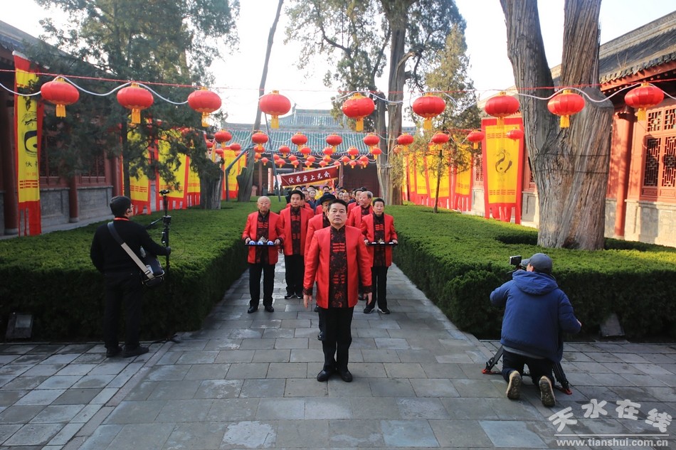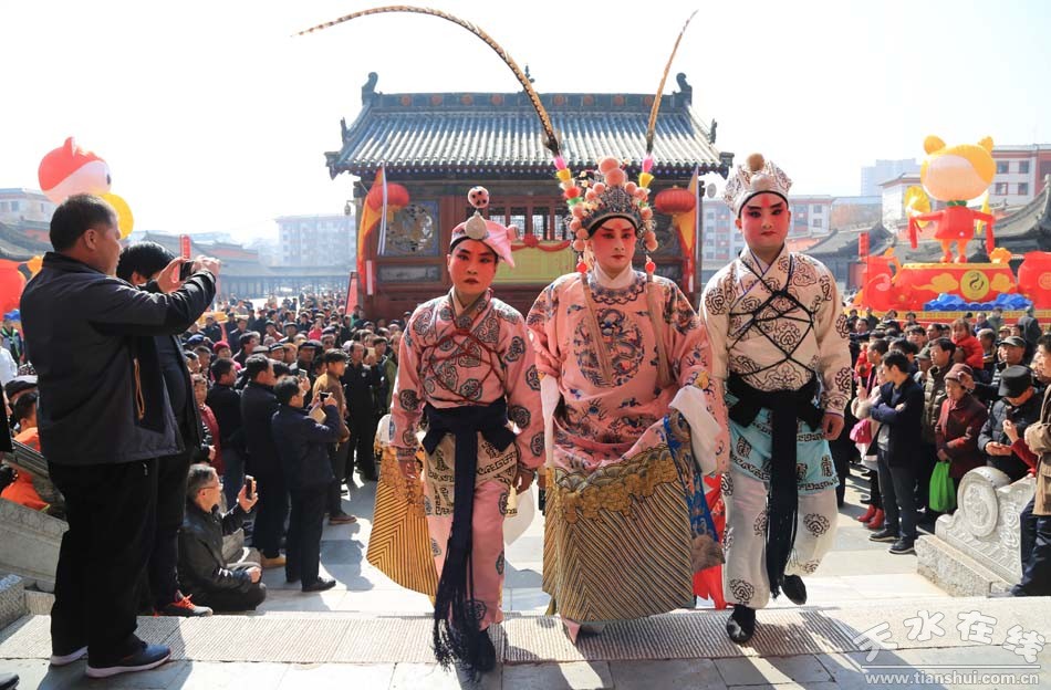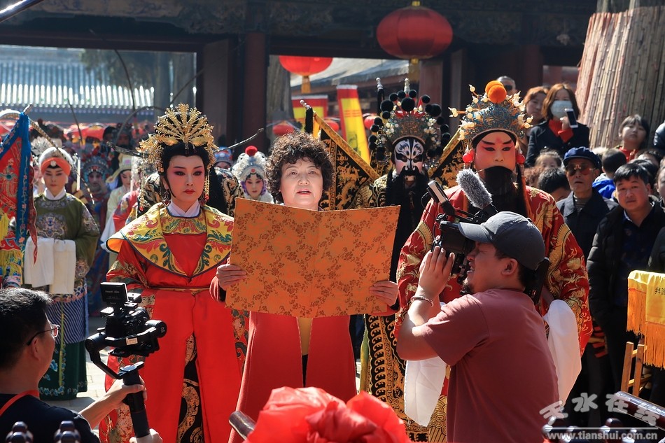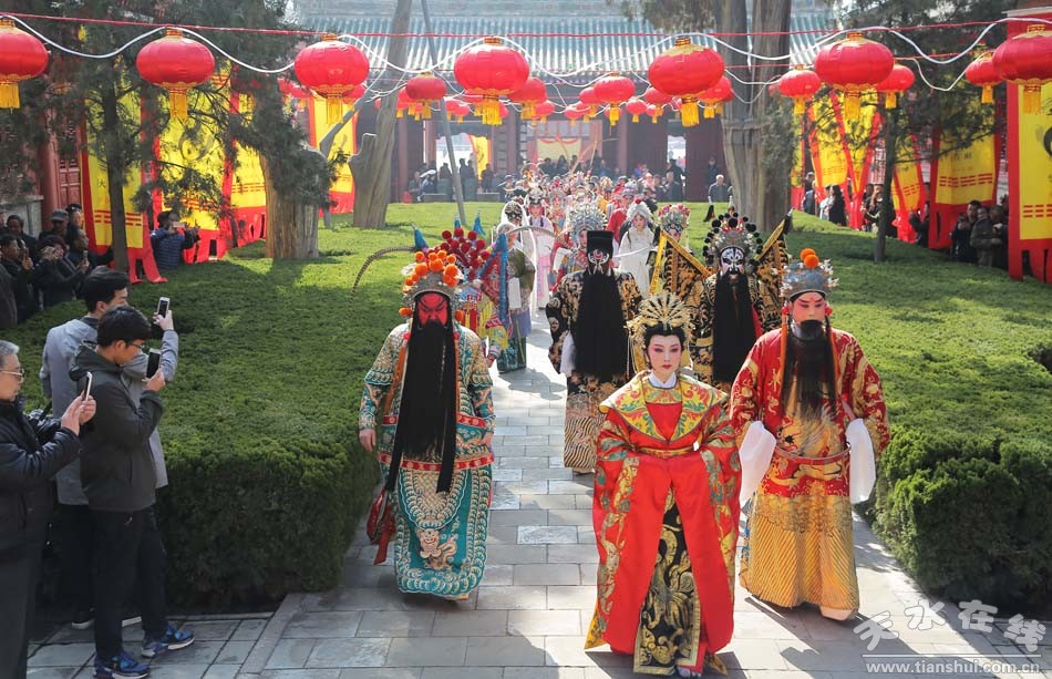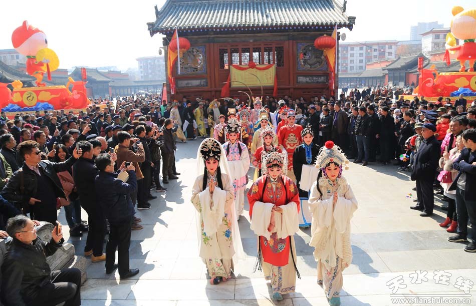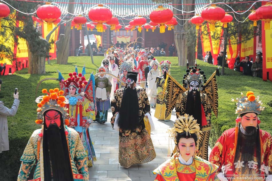 ▲天水市西秦腔研究院(天水市秦劇團)全體演出人員走進伏羲廟參加戊戌(2018)年伏羲廟會開戲儀式之祭拜伏羲儀式