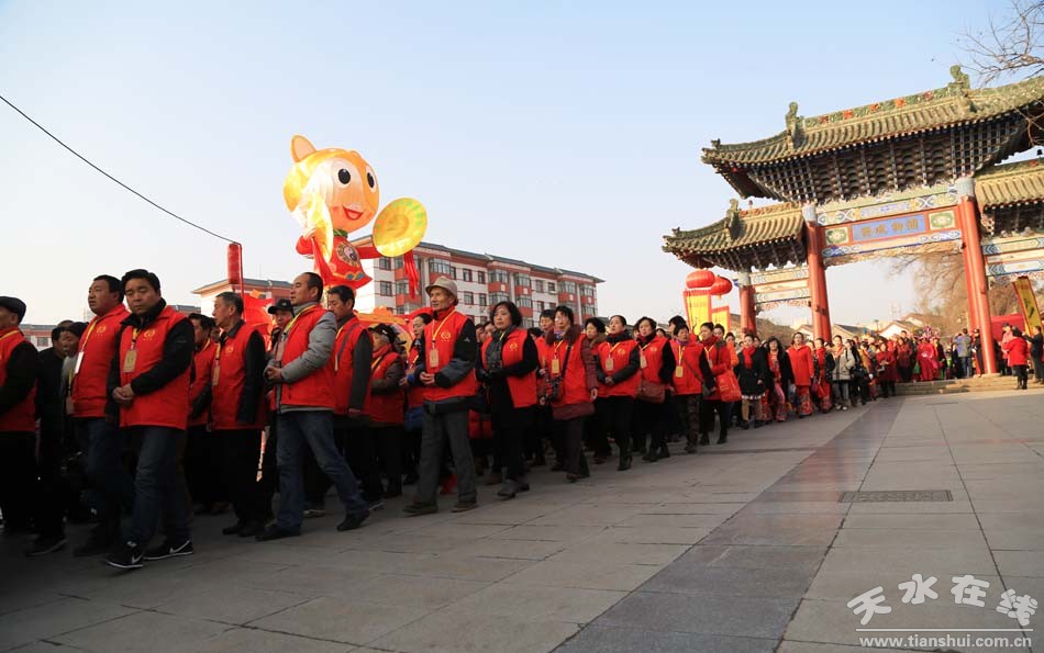隨后,伏羲行像在方神黑爺和儀仗隊伍的“護駕”下,一路出伏羲城東門“巡游”伏羲城,來到位于伏羲廣場的南面,安坐于祭祀供桌之上,舉行迎神儀式。主祭人將迎取的圣水供奉于伏羲行像前,并輔以香蠟、黃表、清茶等祭祀用品。將供奉的圣水灑向大地、灑向萬民,祈禱福佑中華,五谷豐登,國泰民安。同時,祝福天水大地風調(diào)雨順,萬民安康,吉祥如意。隨后,秧歌隊、舞蹈隊、武術(shù)表演等方隊現(xiàn)場表演了傳統(tǒng)民俗節(jié)目。