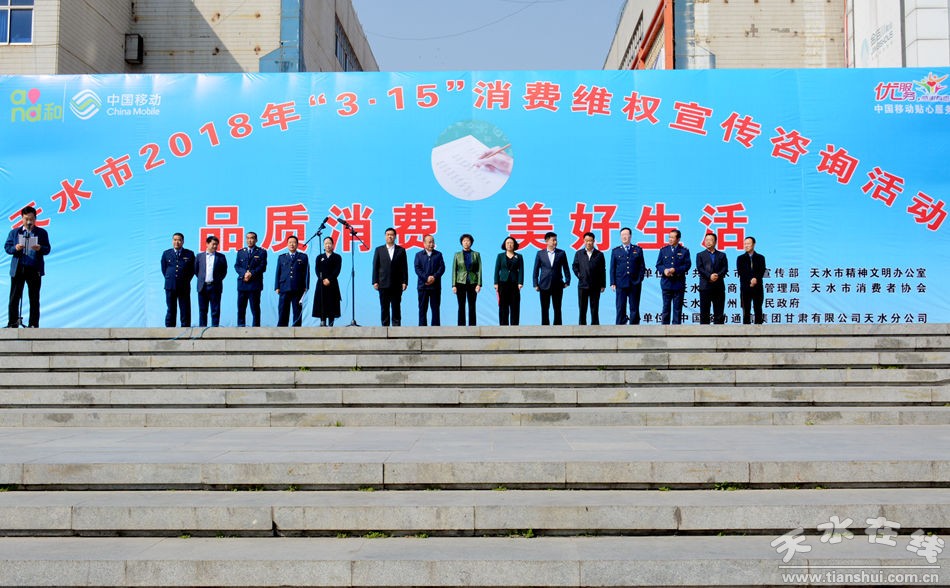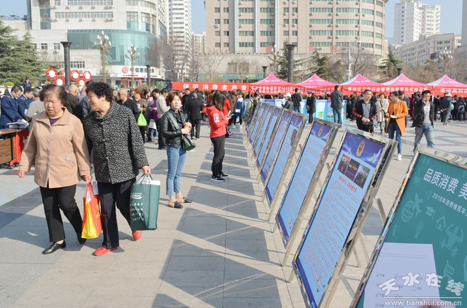 2018年3月15日,是第36個“國際消費(fèi)者權(quán)益日”,由天水市委、市政府主辦,市委宣傳部、市文明辦、市工商局、市消費(fèi)者協(xié)會、秦州區(qū)政府承辦的“3•15”消費(fèi)維權(quán)系列活動在龍城廣場隆重舉辦。市委常委、統(tǒng)戰(zhàn)部長溫利平,市人大常委會副主任張克強(qiáng)、市政府副市長王燕、市政協(xié)副主席逯克宗、市委副秘書長喬振華、市政府副秘書長焦新德及市委宣傳部、市文明辦、市工商局、秦州區(qū)政府分管領(lǐng)導(dǎo)出席宣傳活動。市消費(fèi)者協(xié)會各理事單位,各相關(guān)職能部門執(zhí)法人員以及部分企業(yè)、個體工商經(jīng)營戶代表和各界群眾1000余人參加當(dāng)天的活動,市級新聞媒體進(jìn)行現(xiàn)場采播。