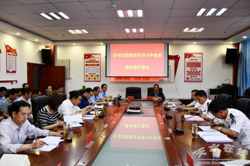 督導(dǎo)組一行先后深入秦安縣公安局、劉坪鎮(zhèn)政府、劉坪派出所,通過聽取匯報(bào)、查閱資料、隨機(jī)提問抽查、現(xiàn)場(chǎng)座談交流等方式,堅(jiān)持問題導(dǎo)向,重點(diǎn)圍繞組織部署、領(lǐng)導(dǎo)責(zé)任、宣傳發(fā)動(dòng)、線索排摸、案件辦理、行業(yè)領(lǐng)域、整頓軟弱基層黨組織及深挖“保護(hù)傘”等方面開展全面深入督導(dǎo)檢查,及時(shí)反饋督查情況,有針對(duì)性地提出了意見建議。在秦安縣公安局召開匯報(bào)會(huì),聽取了秦安縣委常委、政法委書記楊喜春及相關(guān)單位簡(jiǎn)要匯報(bào)。
