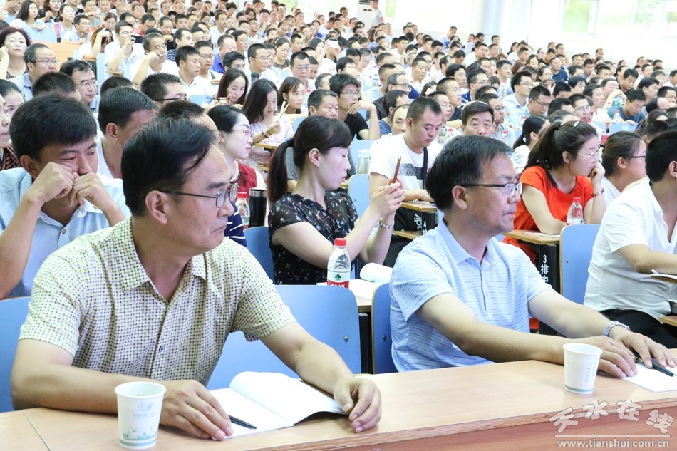 宮輝在講座中首先引用自己在全市基層學(xué)校調(diào)研的案例,以科學(xué)真實(shí)的天水基礎(chǔ)教育數(shù)據(jù)為支撐,論述了“一位好校長(zhǎng)就能辦出一所好學(xué)!钡慕逃},拋出了“好校長(zhǎng)是什么樣的?天水需要什么樣的校長(zhǎng)?如何成為天水好校長(zhǎng)?”三個(gè)方面的問(wèn)題,然后用“靈魂軀體論、個(gè)性素養(yǎng)論、人際角色論、規(guī)模差異論、價(jià)值追求論”詮釋了校長(zhǎng)角色的內(nèi)涵以及現(xiàn)代校長(zhǎng)必須具備的優(yōu)秀品質(zhì),緊接著以天水教育當(dāng)前面臨的基礎(chǔ)教育均衡化、中小學(xué)教師隊(duì)伍縣管校聘改革、新高考改革、學(xué)前教育發(fā)展、全面改薄工程、農(nóng)村教師宿舍周轉(zhuǎn)房工程、農(nóng)村學(xué)校供熱溫暖工程等重點(diǎn)工作任務(wù)為切入點(diǎn),突出強(qiáng)調(diào)了培養(yǎng)一大批好校長(zhǎng)對(duì)于推動(dòng)天水教育提速發(fā)展的重要性和迫切性。