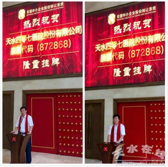 8月17日,天水四零七醫(yī)院股份有限公司在北京全國(guó)中小企業(yè)股份轉(zhuǎn)讓系統(tǒng)成功掛牌“新三板”。天水市副市長(zhǎng)程偉東、市政府黨組成員逯克宗、市機(jī)關(guān)事務(wù)管理局局長(zhǎng)李多江、市政府金融辦副主任胡波、市衛(wèi)計(jì)委副主任曹惠靈,天水四零七醫(yī)院股份有限公司董事長(zhǎng)楊友良、總經(jīng)理孫榕及輔導(dǎo)券商、會(huì)計(jì)師事務(wù)所、律師事務(wù)所等代表共同見證掛牌儀式。