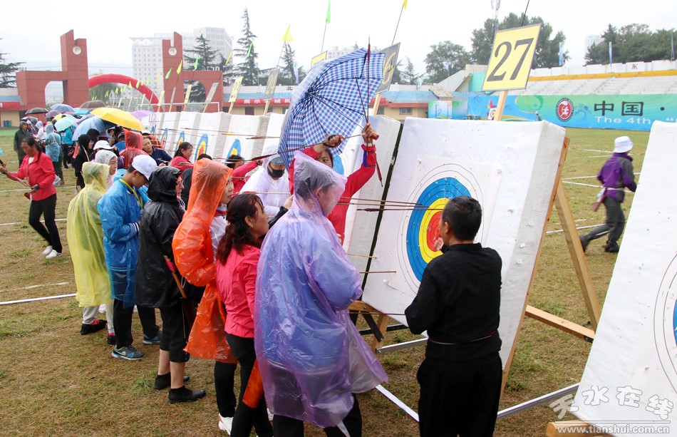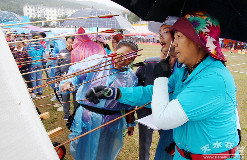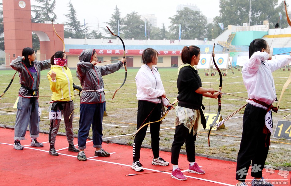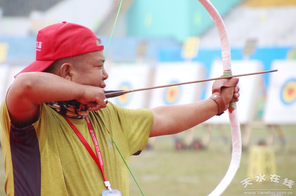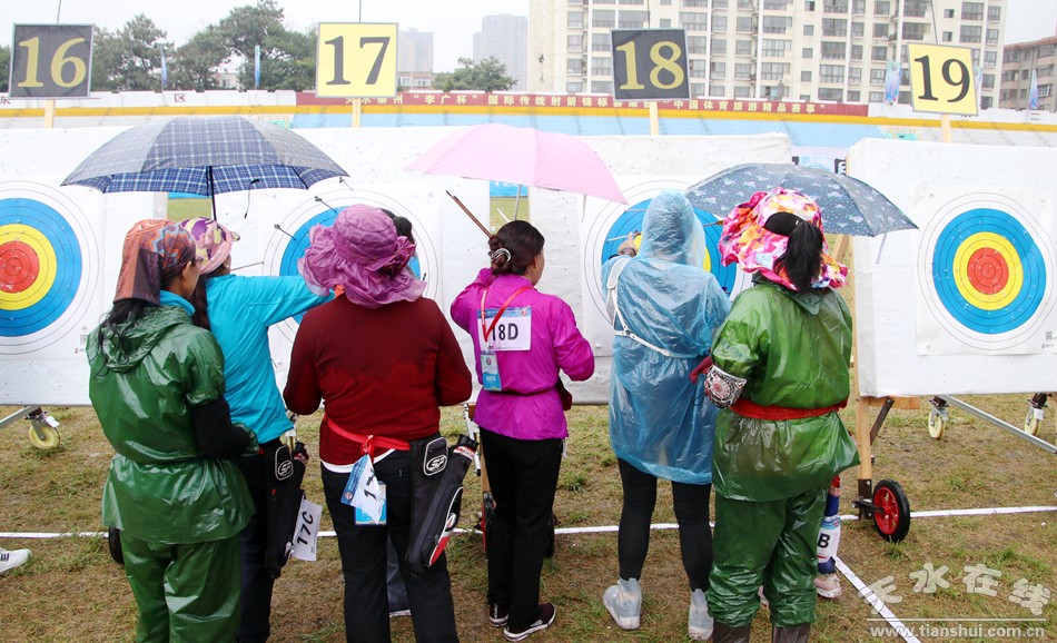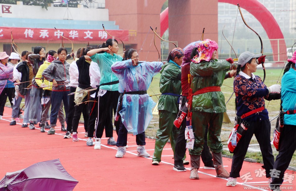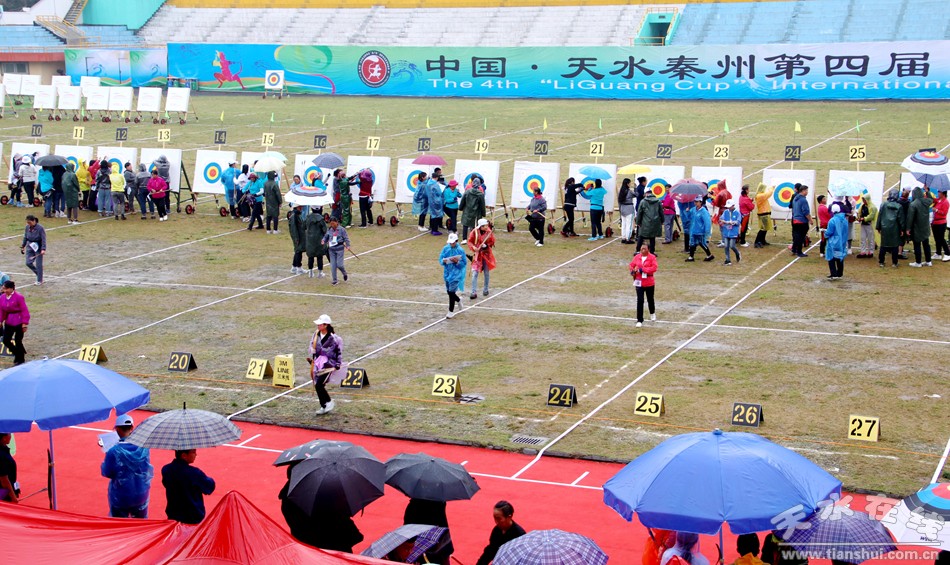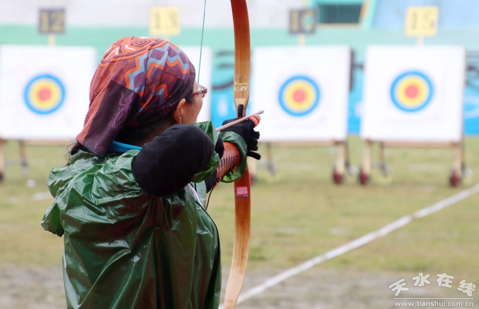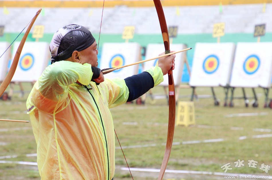 秦州區(qū)外宣辦9月13日訊(劉可 趙鋒 攝影:天水在線)第四屆“李廣杯”國(guó)際傳統(tǒng)射箭錦標(biāo)賽第二天的比賽是在雨中進(jìn)行的。不期而遇的雨天絲毫沒(méi)有影響選手們的參賽激情。成人組的選手們?cè)谟曛袕埞罴徽股渌嚒?