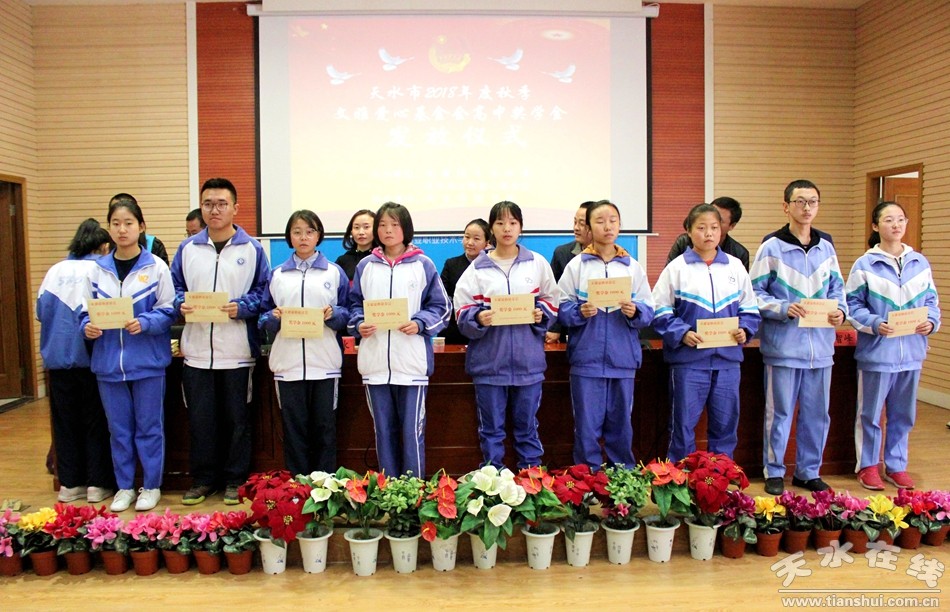 10月11日,天水市2018年度文雅愛心基金會高中獎學金發(fā)放儀式在市圖書館舉行。我市590名優(yōu)秀高中生每人獲得1000元資助,獎學金金額共計59萬元。
