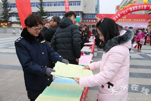 2018年12月4日是第五個(gè)國(guó)家憲法日,也是第一個(gè)“憲法宣傳周”,天水市工商局在龍城廣場(chǎng)參加了以“尊崇憲法、學(xué)習(xí)憲法、遵守憲法、維護(hù)憲法、運(yùn)用憲法”為主題的法制宣傳活動(dòng)。