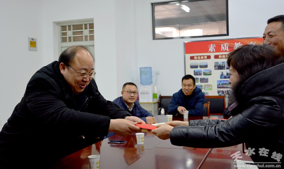 1月31日,天水市委常委、副市長宮輝來到天水市逸夫?qū)嶒炛袑W(xué),看望慰問聯(lián)系專家計衛(wèi)珍、楊尚義,為他們送去了新春的祝福和慰問金。