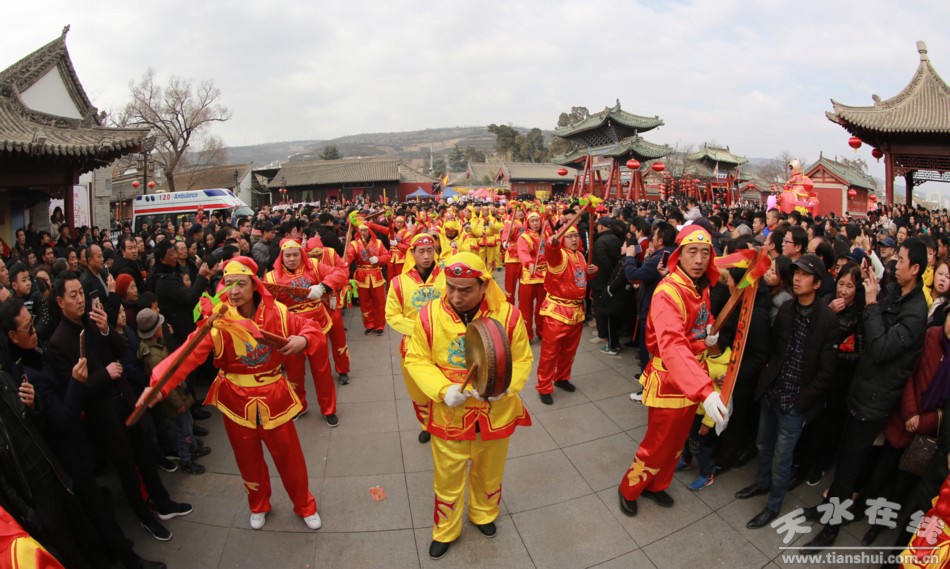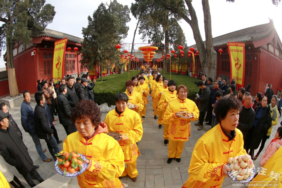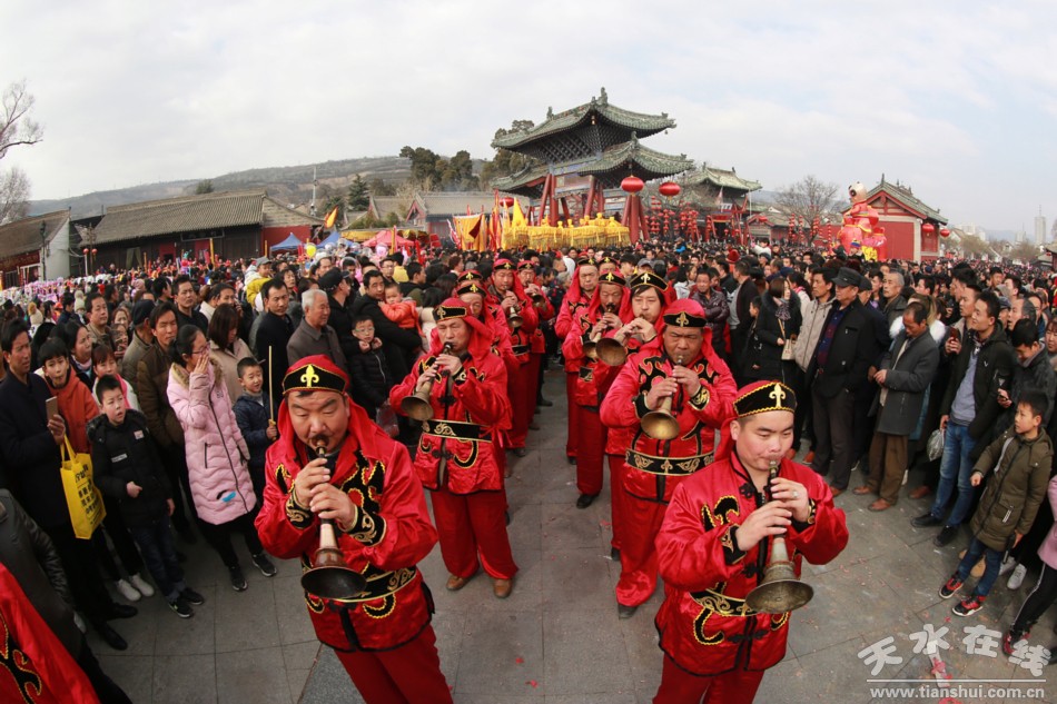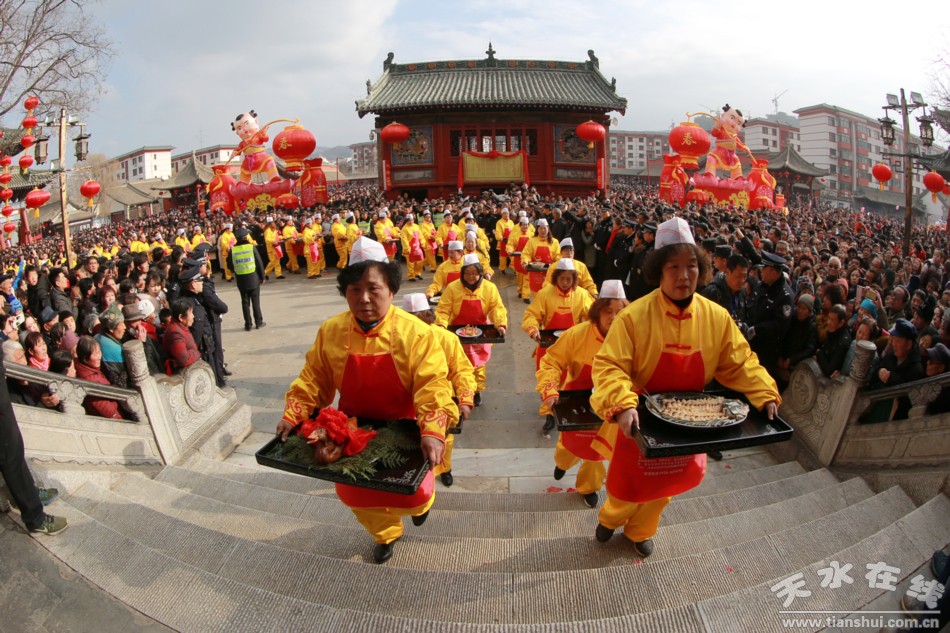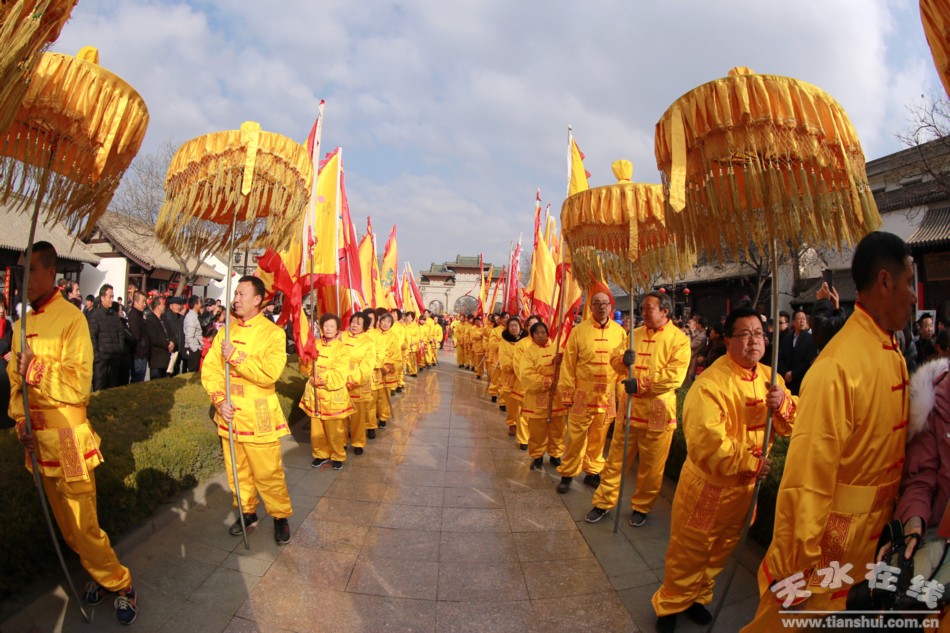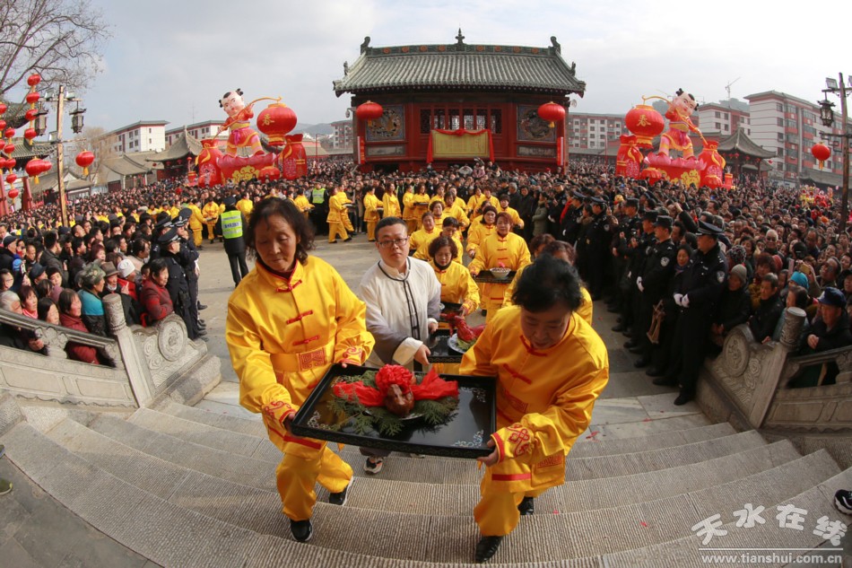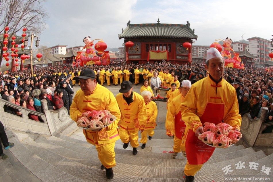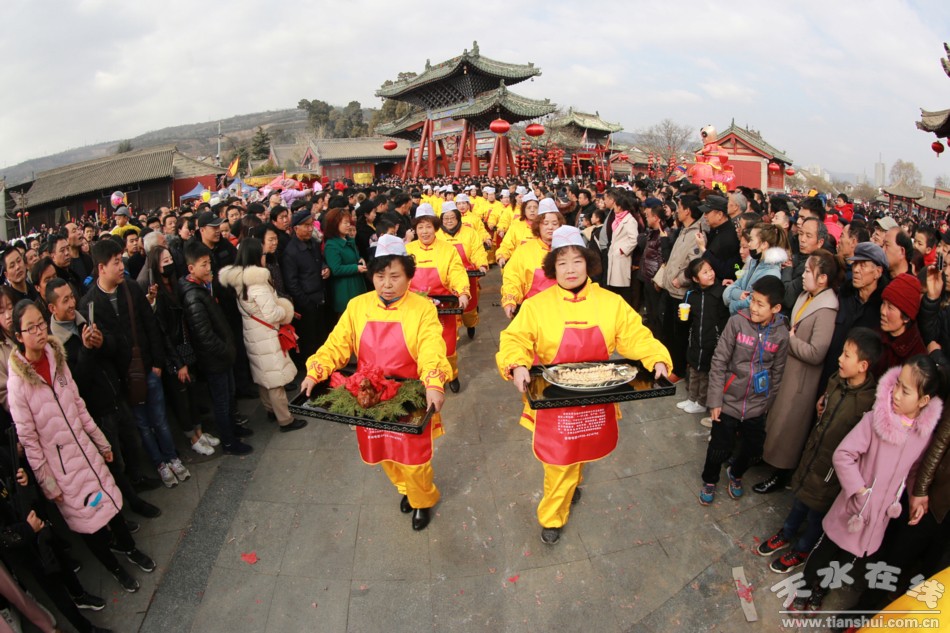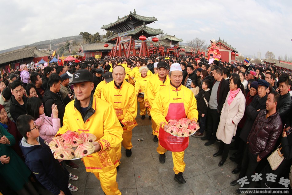 2月19日(農(nóng)歷正月十五)下午,在春祭伏羲典禮即將于明日零時(shí)舉行之際,天水伏羲廟己亥(2019)年春祭伏羲活動(dòng)之迎獻(xiàn)飯儀式在先天殿月臺(tái)舉行。迎獻(xiàn)飯儀仗隊(duì)伍約1000多人一路走來,聲勢浩大,鼓樂喧天,參加廟會(huì)的近10萬名群眾觀看了儀式。