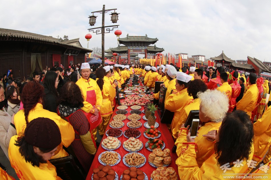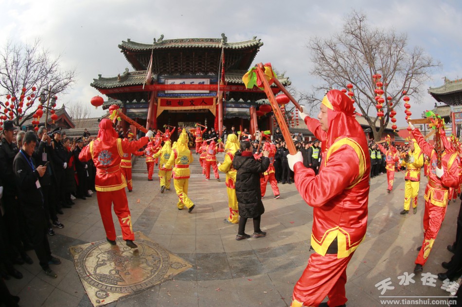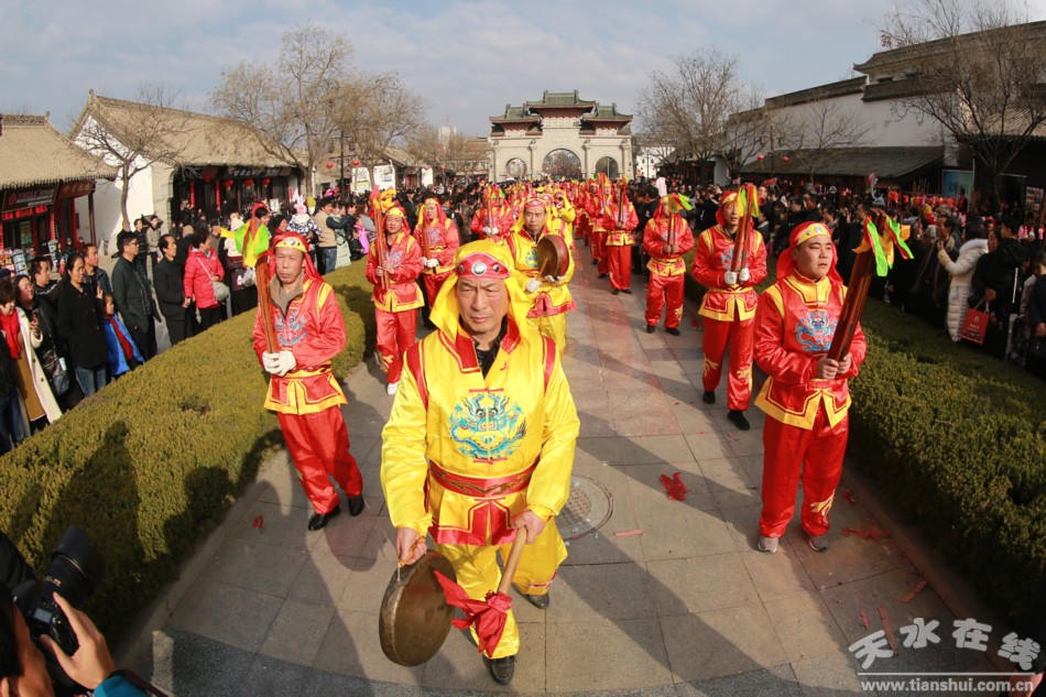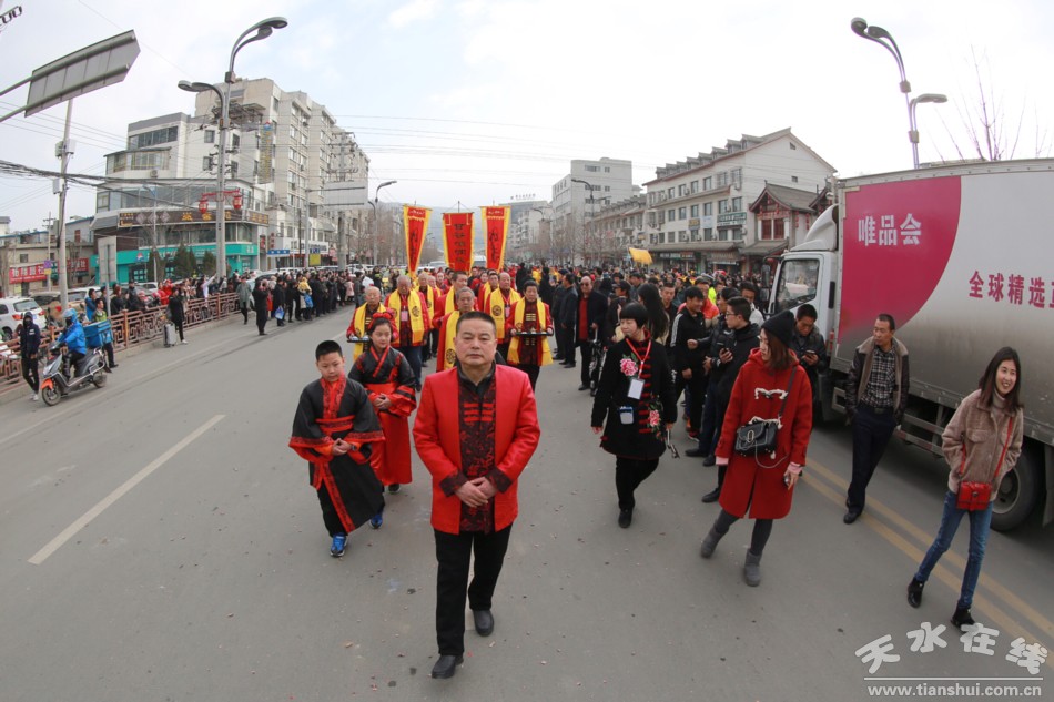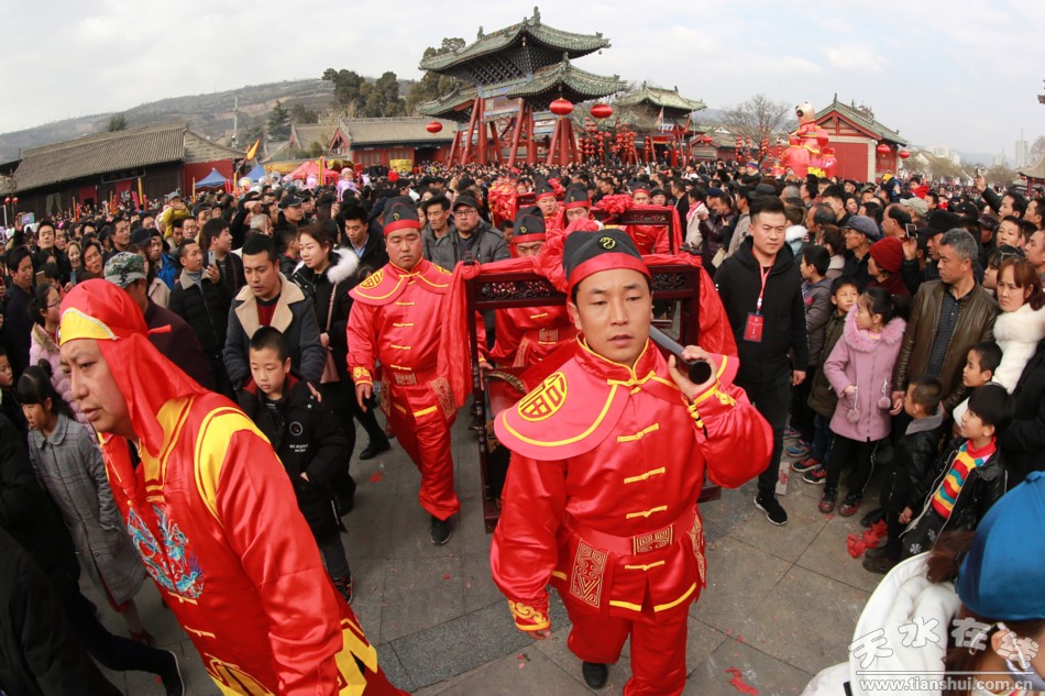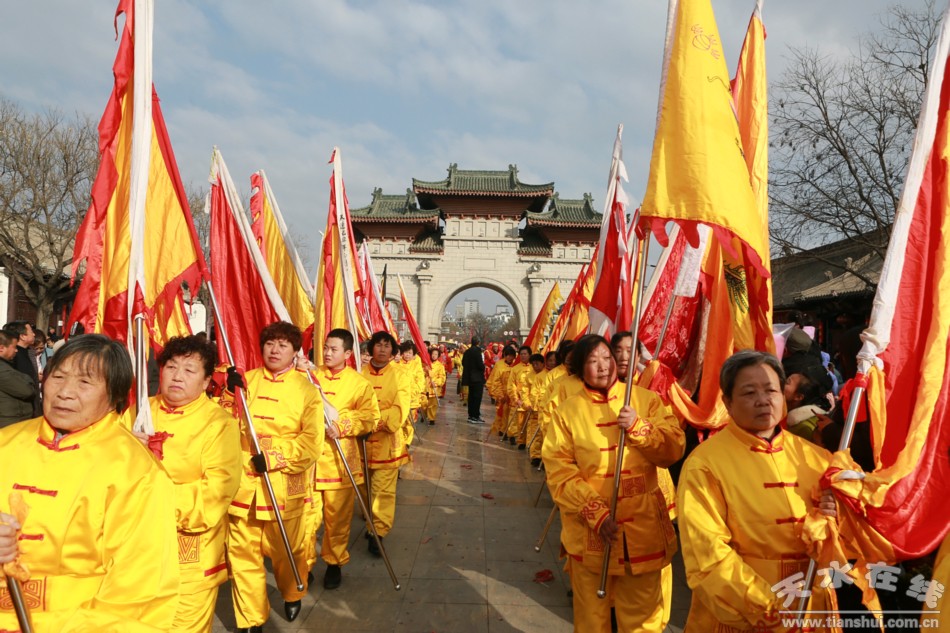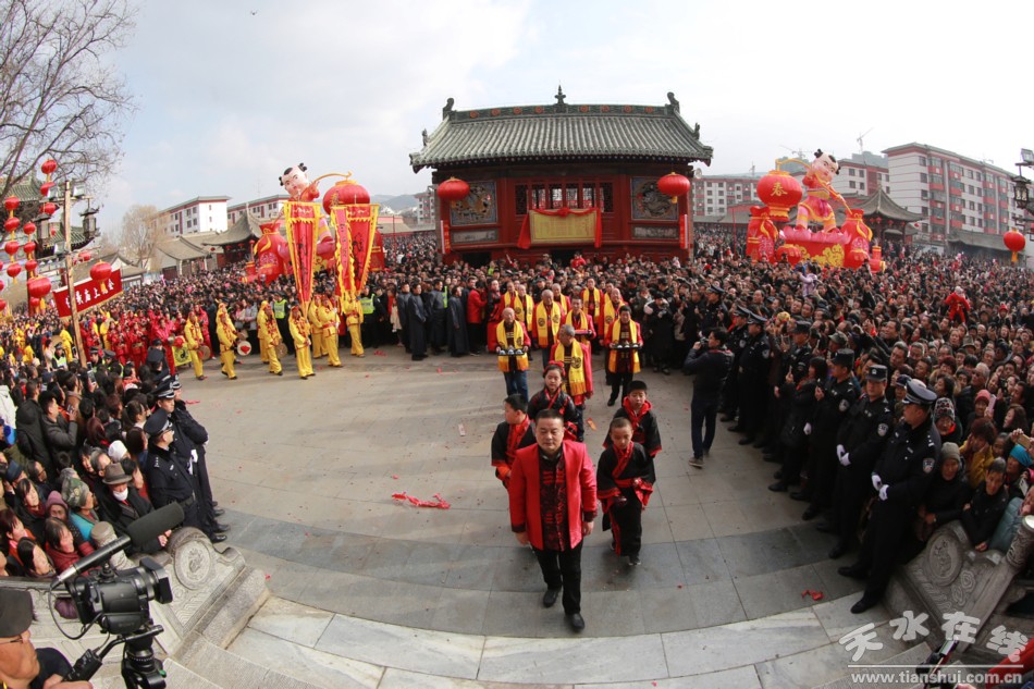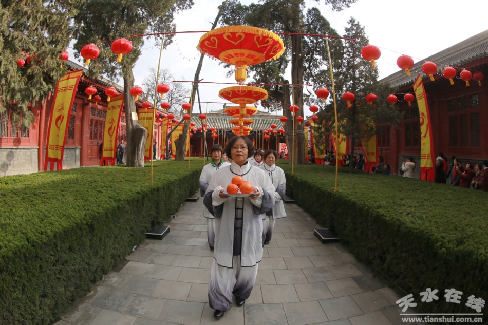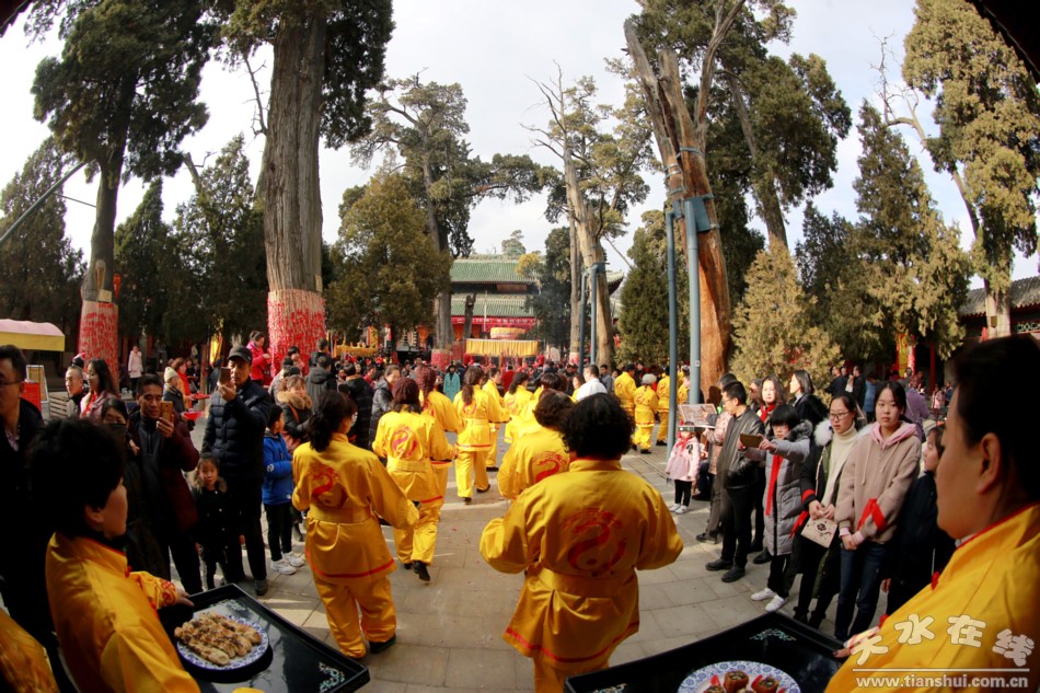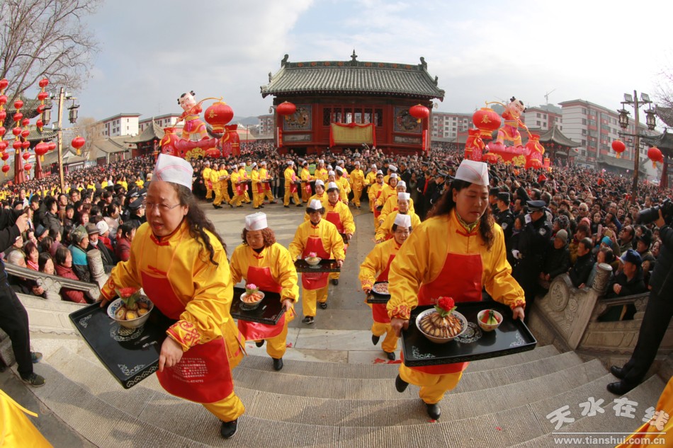 2月19日(農(nóng)歷正月十五)下午,在春祭伏羲典禮即將于明日零時(shí)舉行之際,天水伏羲廟己亥(2019)年春祭伏羲活動(dòng)之迎獻(xiàn)飯儀式在先天殿月臺(tái)舉行。迎獻(xiàn)飯儀仗隊(duì)伍約1000多人一路走來,聲勢浩大,鼓樂喧天,參加廟會(huì)的近10萬名群眾觀看了儀式。