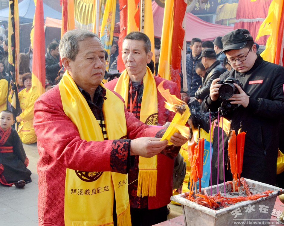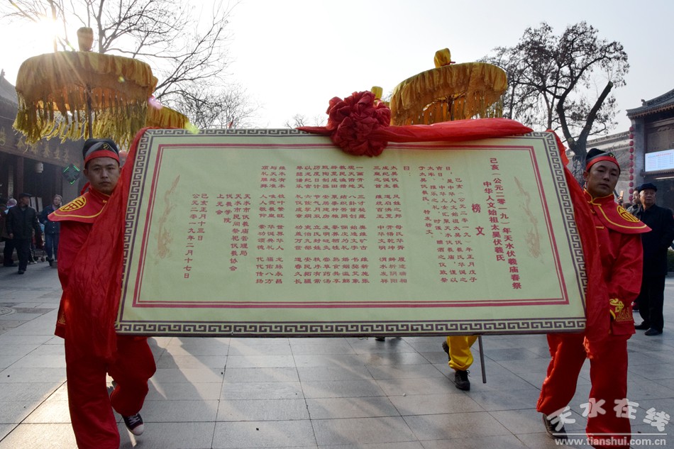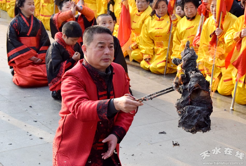 2月21日下午,農(nóng)歷正月十七,天水伏羲廟舉行己亥(2019)年春祭伏羲之送神、焚化榜文儀式。議程是:請方神黑爺至伏羲廟先天殿月臺;明燭、上香、化表、獻茶、焚化榜文;恭送伏羲神位仙升。
