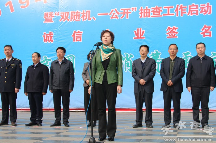 活動儀式上,市市場監(jiān)管局黨組書記、局長王宏瑋介紹了2019年天水市“3·15”消費(fèi)維權(quán)年主題內(nèi)涵及系列活動安排;黨組成員、副局長聶惠仁宣布“雙隨機(jī)、一公開”抽查結(jié)果;秦州區(qū)市場監(jiān)管局主要負(fù)責(zé)人進(jìn)行了表態(tài)發(fā)言;天水移動公司負(fù)責(zé)人代表誠信企業(yè)宣讀了“3.15誠信宣言”;誠信企業(yè)進(jìn)行了誠信承諾簽名活動。