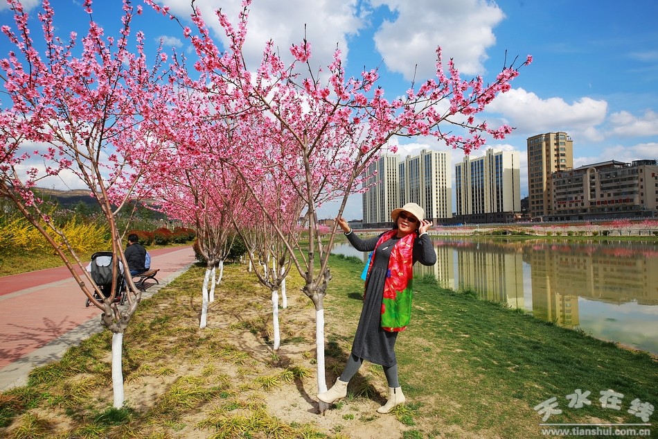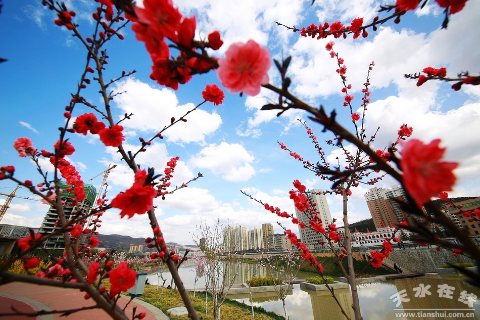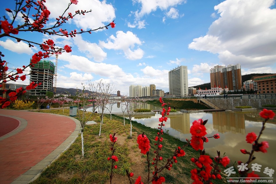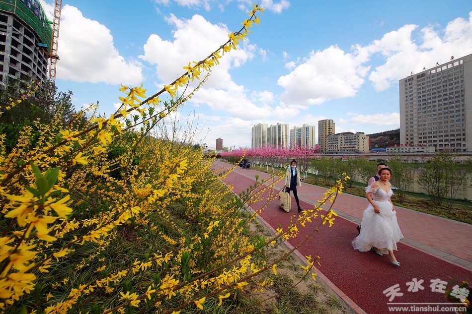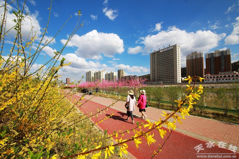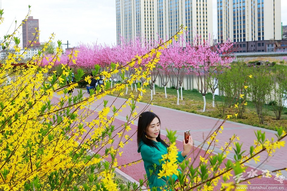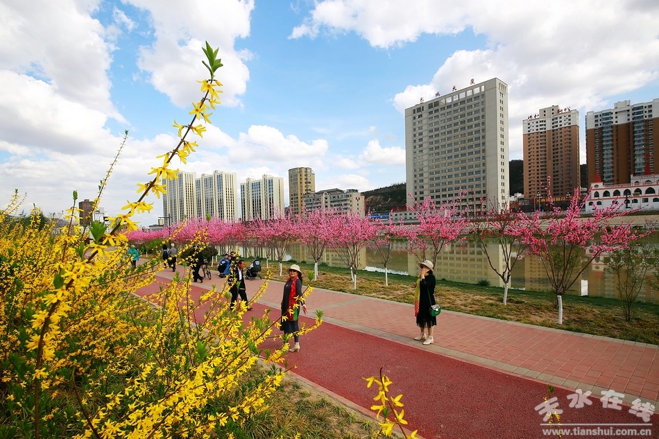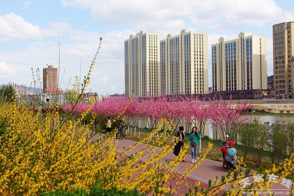 天水在線4月3日攝影報(bào)道 四月的天水,花紅柳綠,一派生機(jī)盎然,隱藏了好長(zhǎng)一段時(shí)間的“天水藍(lán)”又來到了人間。櫻梅吐蕊,丁香含情,連翹花開的張揚(yáng)而熱情;藍(lán)天下,天水湖兩岸,人們相約藉河風(fēng)情線上賞花踏春,拍照留影。