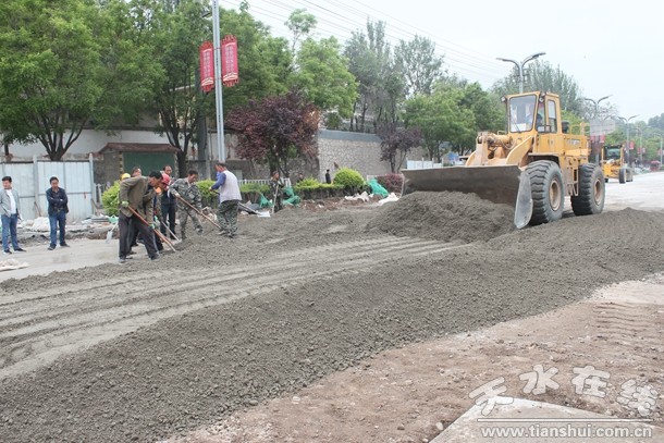 (成紀(jì)大道西路提升改造工程綠色市場段正在進(jìn)行馬路路緣石鋪設(shè)前的準(zhǔn)備工作)