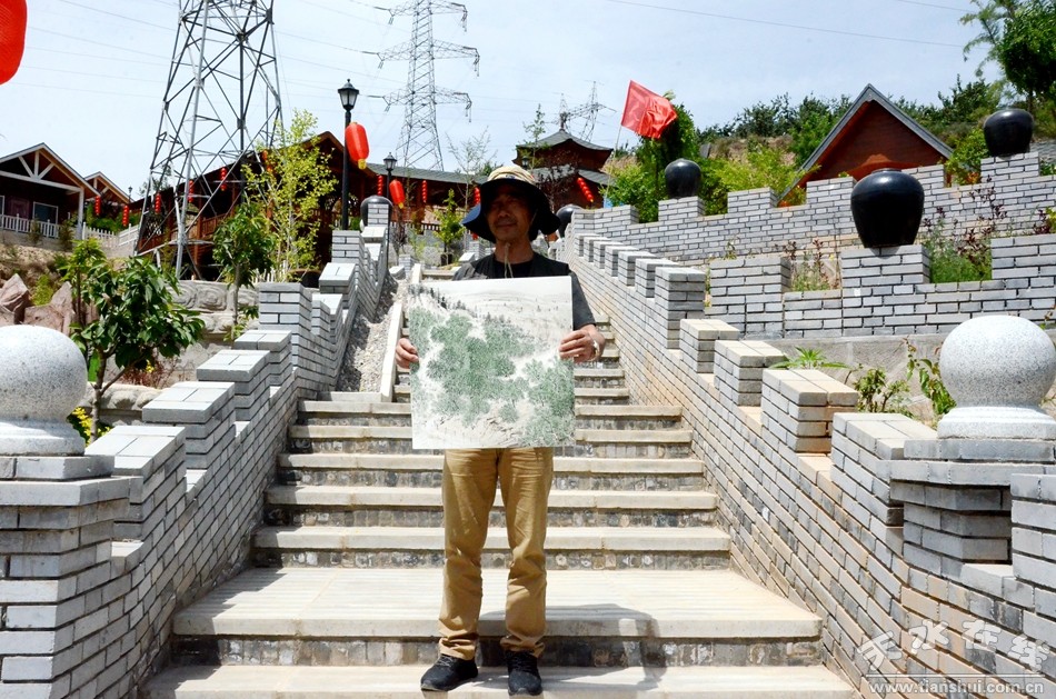 (陳華強(qiáng)攜現(xiàn)場創(chuàng)作的作品在煙鋪農(nóng)莊留影)