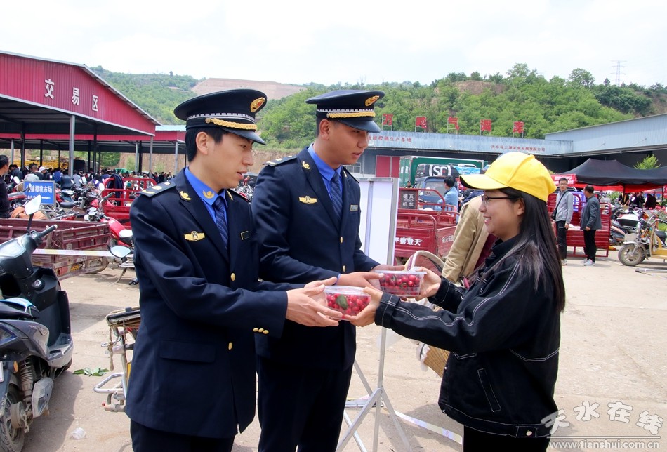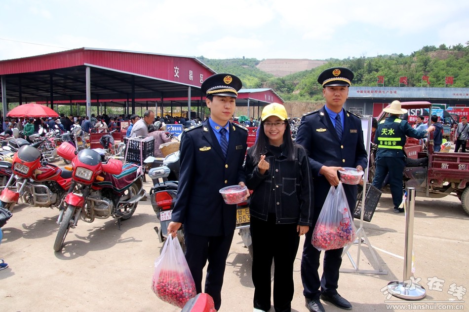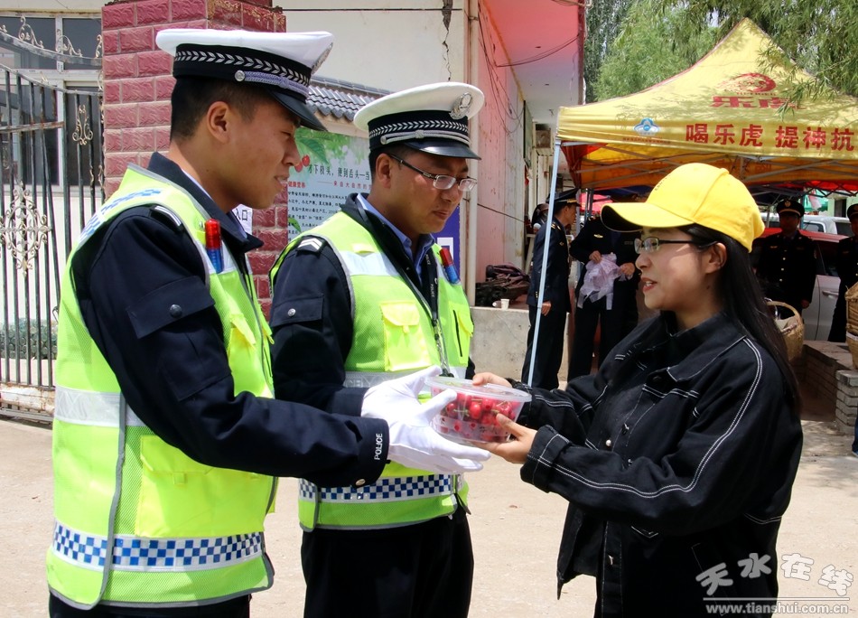 5月28日,天水在線和煙鋪村果農(nóng)向在煙鋪村保障櫻桃交易秩序和交通秩序的交警和城管送上煙鋪大櫻桃,請(qǐng)他們品嘗,感謝他們?yōu)楣r(nóng)著想!