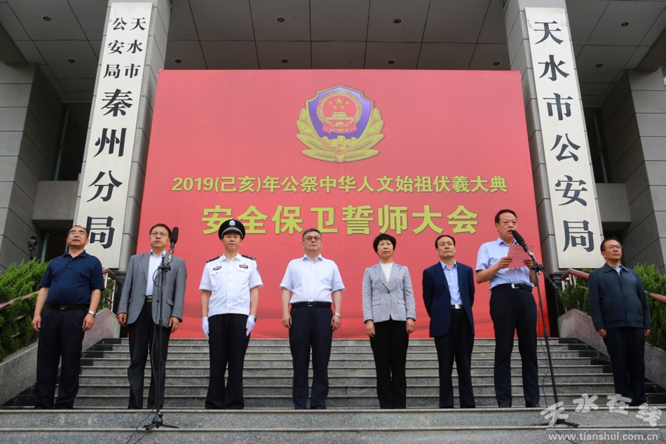 6月16日上午9時(shí),天水市2019(己亥)年公祭中華人文始祖伏羲大典安全保衛(wèi)誓師大會(huì)在市公安局召開,號(hào)召全市安保衛(wèi)士堅(jiān)持最高標(biāo)準(zhǔn),堅(jiān)定必勝信心,全心投入,全力以赴,依法執(zhí)勤,熱情服務(wù),恪盡職守,攻堅(jiān)克難,不負(fù)重托,不辱使命,堅(jiān)決打贏大典安保硬仗,確保大典絕對(duì)安全。