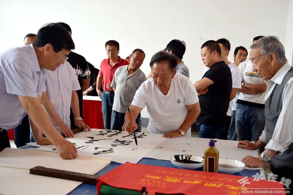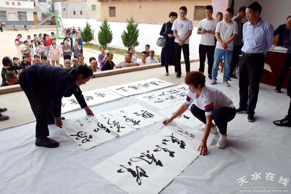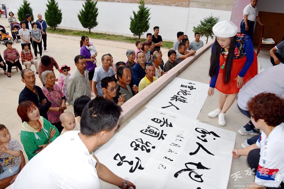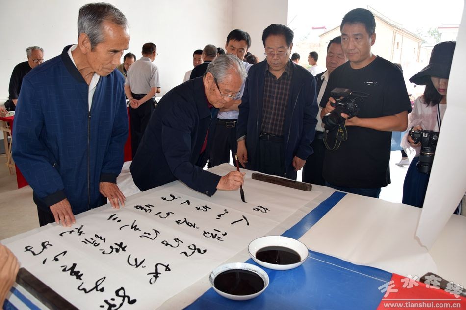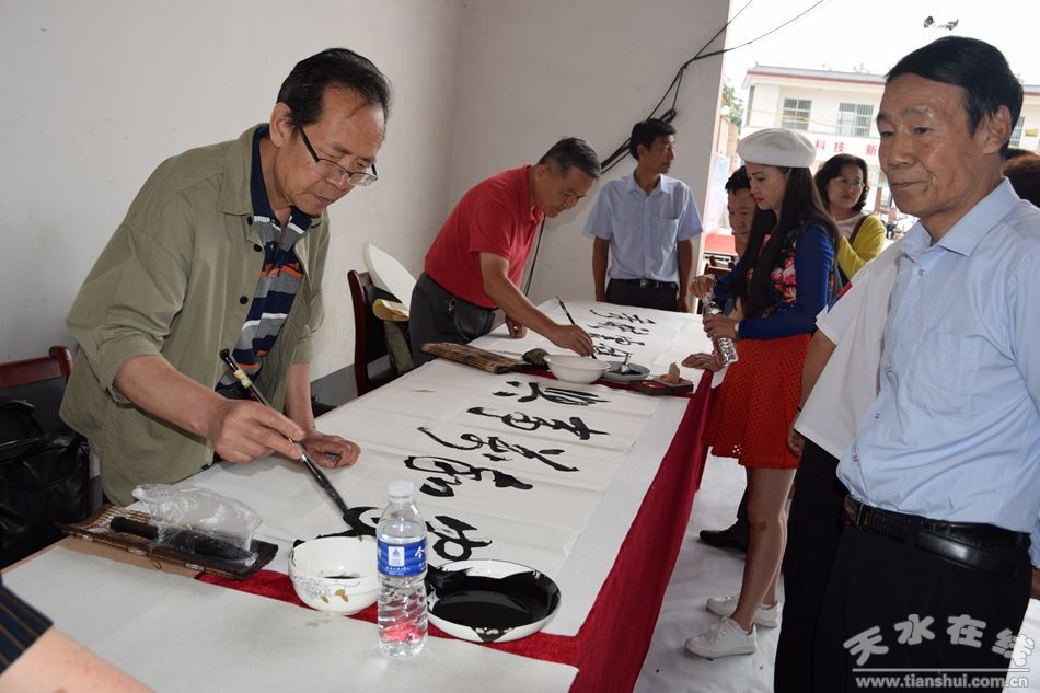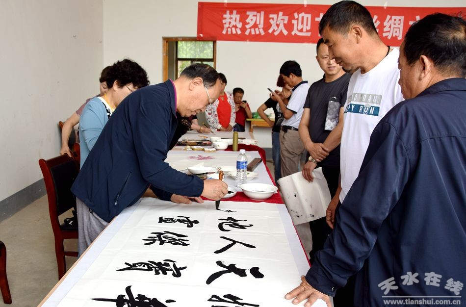 當(dāng)天上午,甘肅省人大常委會(huì)原副主任程有清、甘肅省政府原秘書長(zhǎng)于中正、甘肅省教育廳原廳長(zhǎng)馬培芳、甘肅省外事辦原主任郭穎純、甘肅省科協(xié)原主任曹昌光、蘭州市政協(xié)原主席,甘肅絲綢之路協(xié)會(huì)會(huì)長(zhǎng)李繼彬,甘肅省甘聯(lián)大學(xué)原校長(zhǎng),甘肅絲綢之路協(xié)會(huì)副會(huì)長(zhǎng)馬志榮,甘肅省民委原主任李森林,天水市人大常委會(huì)原主任李世榮,天水市人大常委會(huì)原副主任白志家、天水市政協(xié)原副主席陶元德,天水市文聯(lián)原主席王進(jìn)文,天水市書協(xié)原副主席蘇建喜等省、市老領(lǐng)導(dǎo)和和部分書畫家一起不辭辛苦,一進(jìn)村便鋪開紙墨,現(xiàn)場(chǎng)為群眾創(chuàng)作書畫作品。在2個(gè)多小時(shí)的時(shí)間里,他們?yōu)楫?dāng)?shù)厝罕妱?chuàng)作了100多幅書畫作品,為當(dāng)?shù)厝罕姺钌狭艘坏赖赖木赖臅嫶蟛停艿搅烁刹咳罕姷臒崃覛g迎和高度贊譽(yù)。