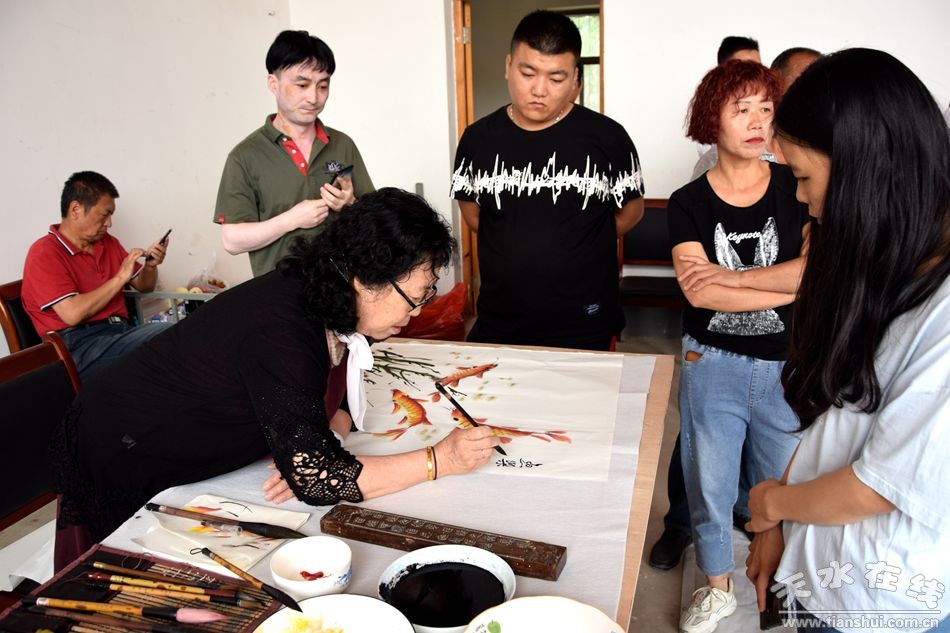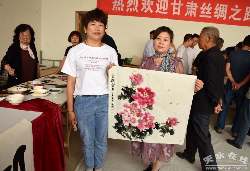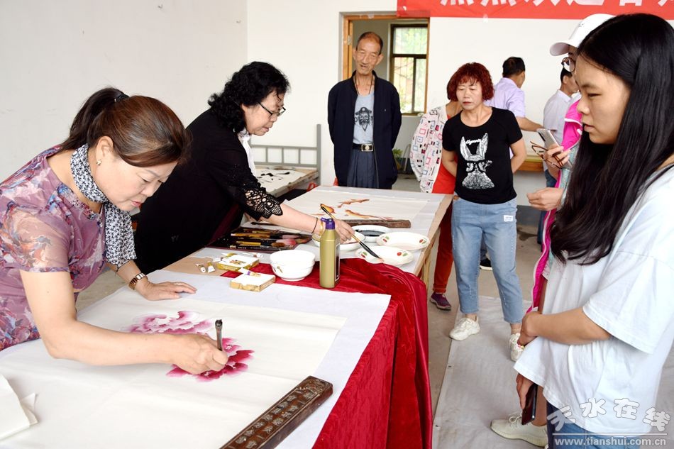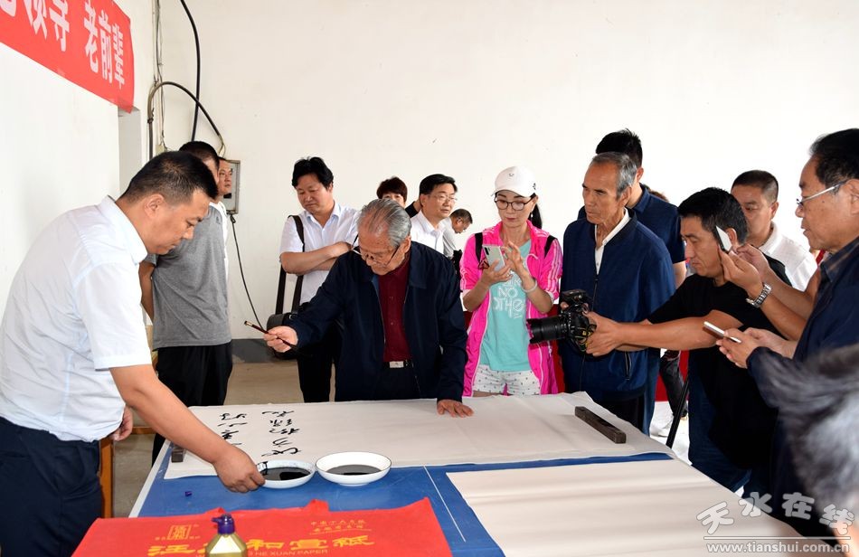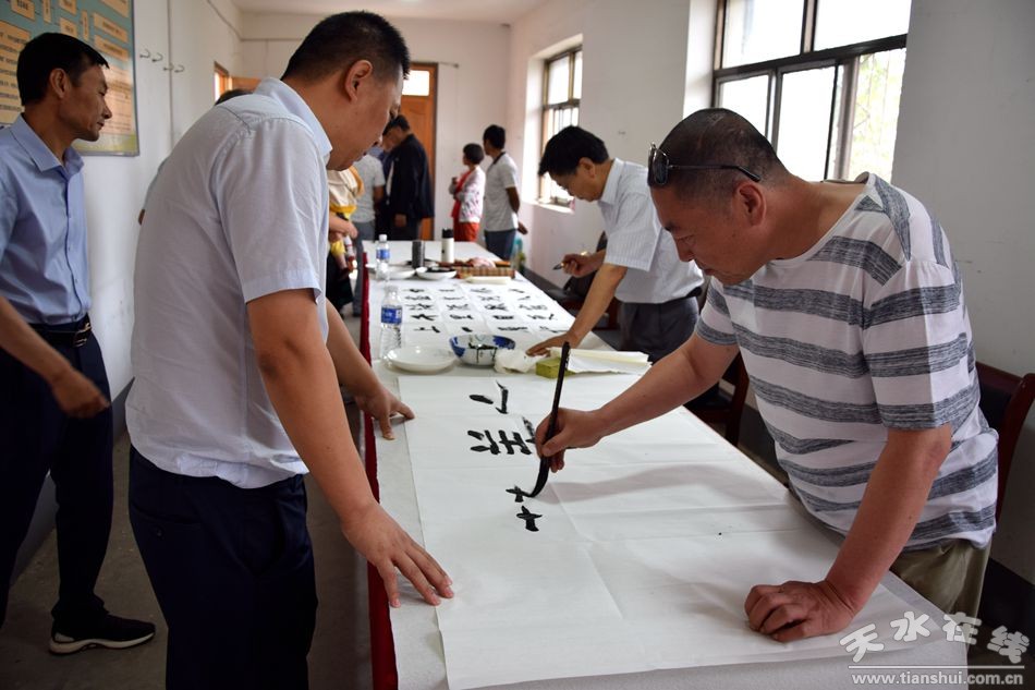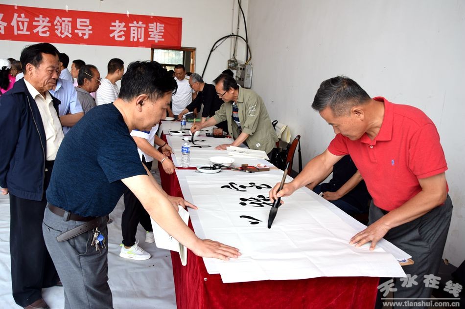 當(dāng)天上午,甘肅省人大常委會(huì)原副主任程有清、甘肅省政府原秘書長(zhǎng)于中正、甘肅省教育廳原廳長(zhǎng)馬培芳、甘肅省外事辦原主任郭穎純、甘肅省科協(xié)原主任曹昌光、蘭州市政協(xié)原主席,甘肅絲綢之路協(xié)會(huì)會(huì)長(zhǎng)李繼彬,甘肅省甘聯(lián)大學(xué)原校長(zhǎng),甘肅絲綢之路協(xié)會(huì)副會(huì)長(zhǎng)馬志榮,甘肅省民委原主任李森林,天水市人大常委會(huì)原主任李世榮,天水市人大常委會(huì)原副主任白志家、天水市政協(xié)原副主席陶元德,天水市文聯(lián)原主席王進(jìn)文,天水市書協(xié)原副主席蘇建喜等省、市老領(lǐng)導(dǎo)和和部分書畫家一起不辭辛苦,一進(jìn)村便鋪開紙墨,現(xiàn)場(chǎng)為群眾創(chuàng)作書畫作品。在2個(gè)多小時(shí)的時(shí)間里,他們?yōu)楫?dāng)?shù)厝罕妱?chuàng)作了100多幅書畫作品,為當(dāng)?shù)厝罕姺钌狭艘坏赖赖木赖臅嫶蟛停艿搅烁刹咳罕姷臒崃覛g迎和高度贊譽(yù)。