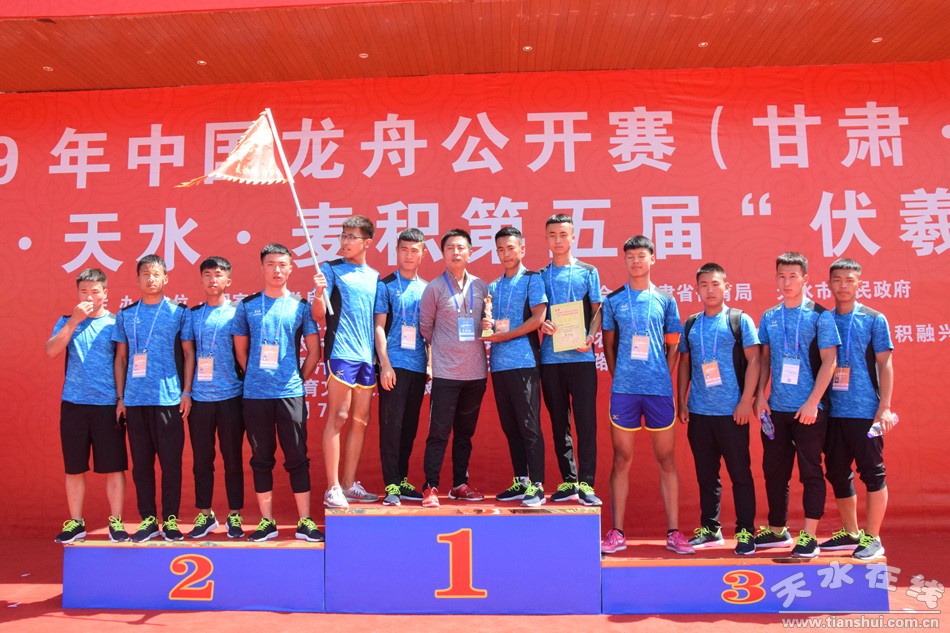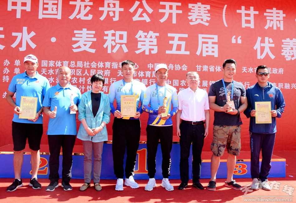 ▲為甲B組12人龍舟200米直道賽前三名頒獎(jiǎng)(第一名:秦州區(qū)龍舟隊(duì) 第二名:秦安縣龍舟隊(duì) 第三名:麥積區(qū)龍舟隊(duì))
