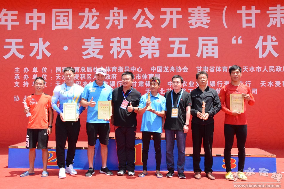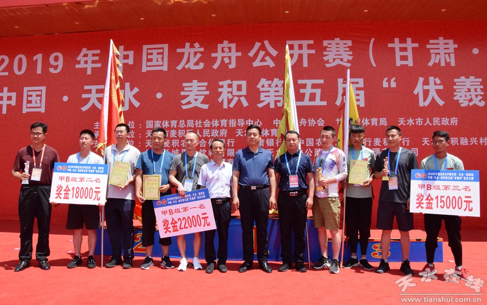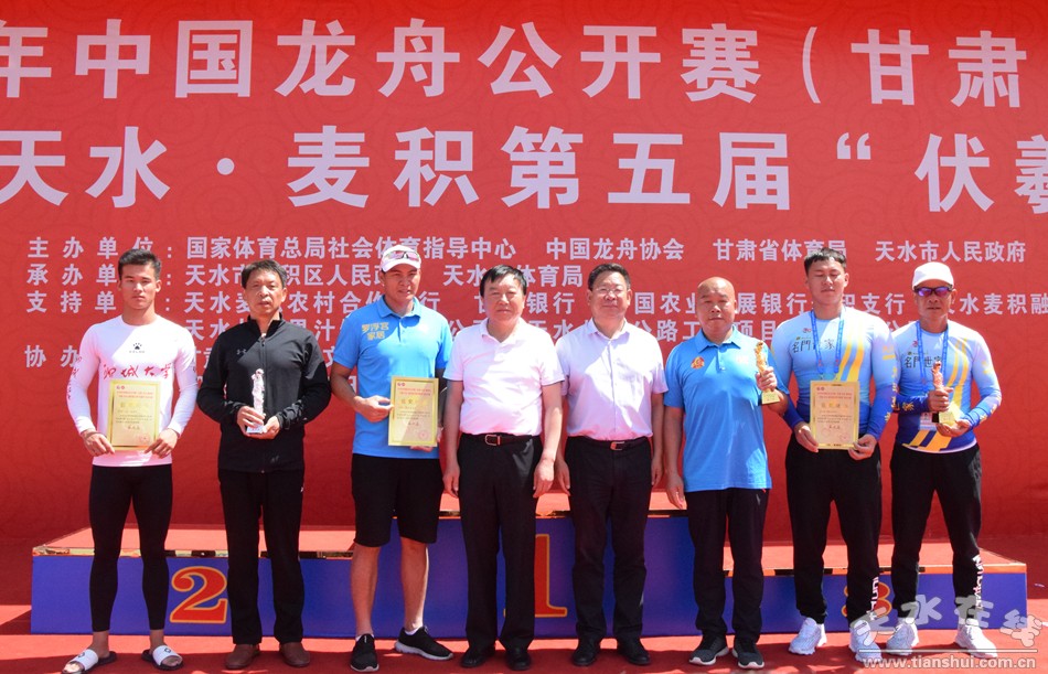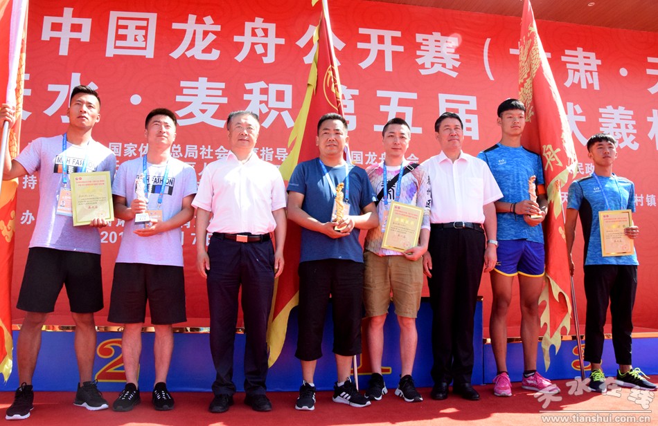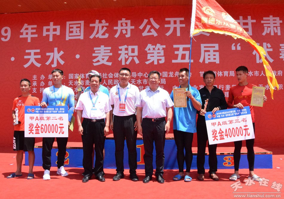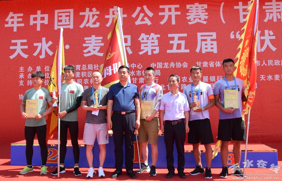 ▲為甲B組12人龍舟500米直道賽前三名頒獎(jiǎng)(第一名:秦州區(qū)龍舟隊(duì) 第二名:武山縣龍舟隊(duì) 第三名:秦安縣龍舟隊(duì))