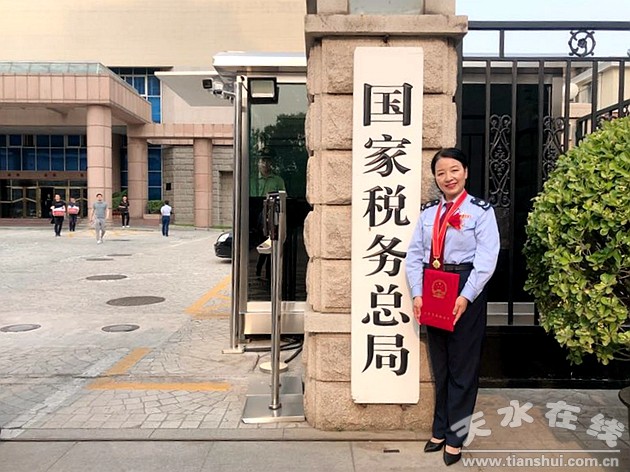▲受獎(jiǎng)后,剡紅紅在國(guó)家稅務(wù)員門前留影
