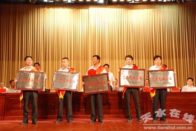 ▲甘肅省工商局黨組成員、副局長(zhǎng)宋金圣(左)為“武山韭菜”獲得國(guó)家地理標(biāo)志證明商標(biāo)授牌