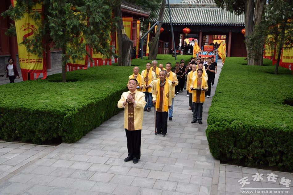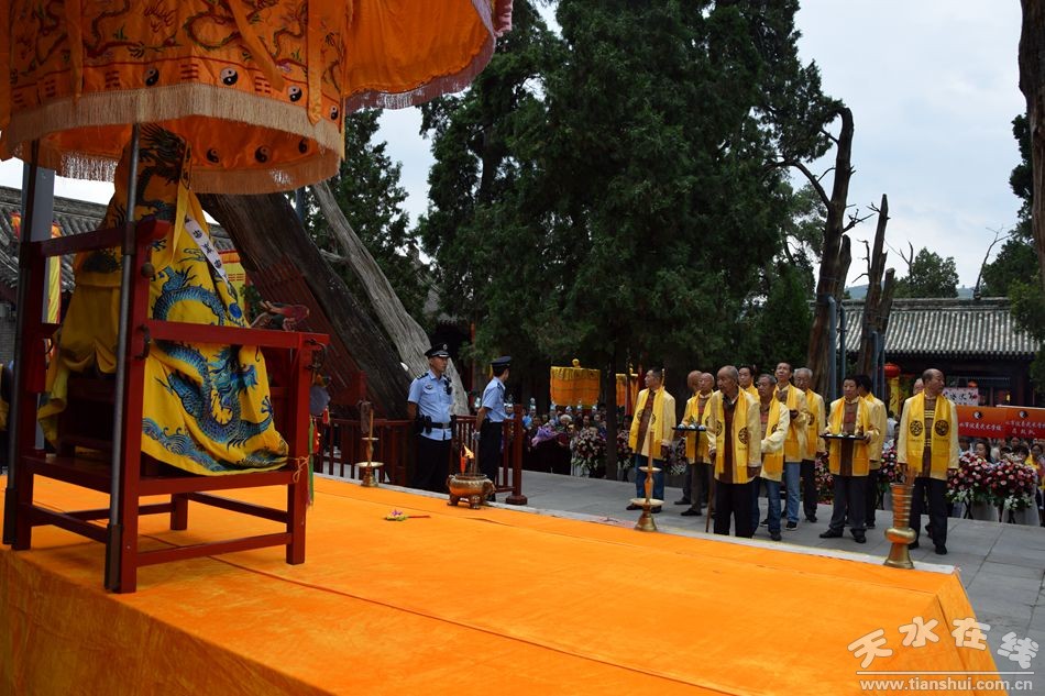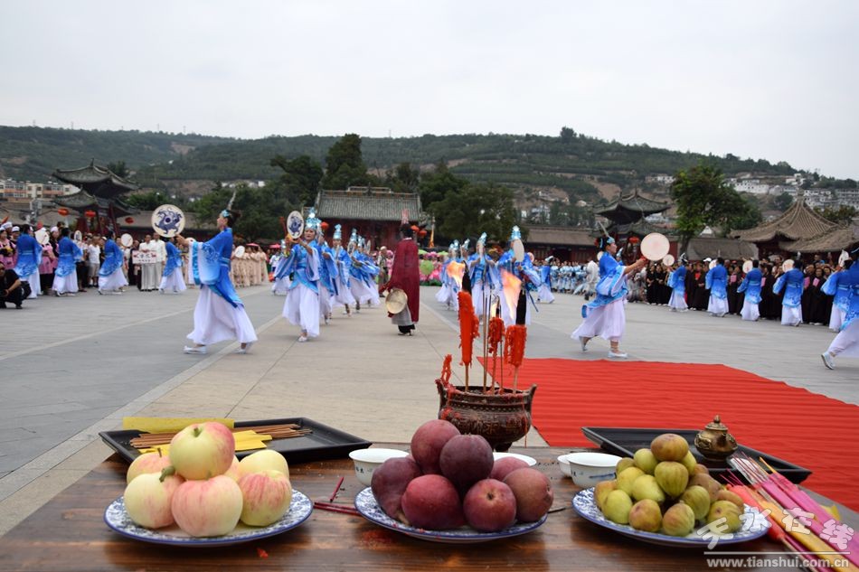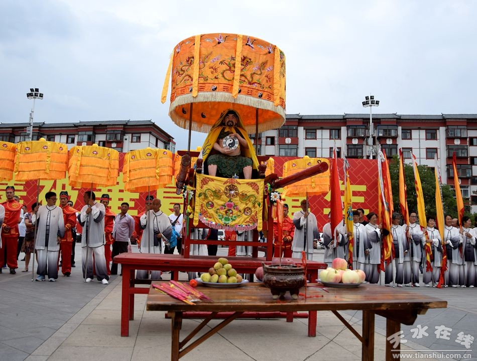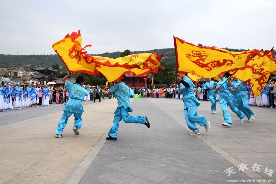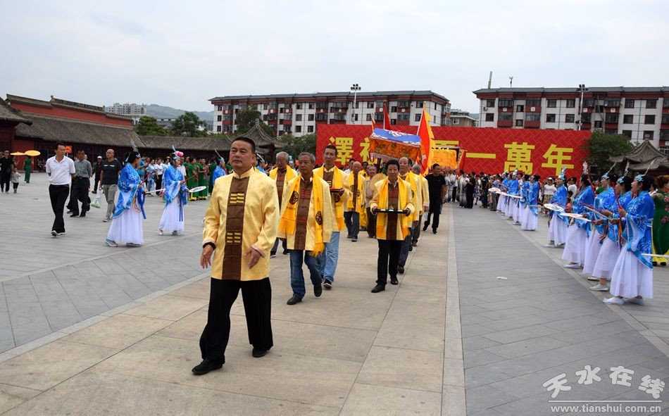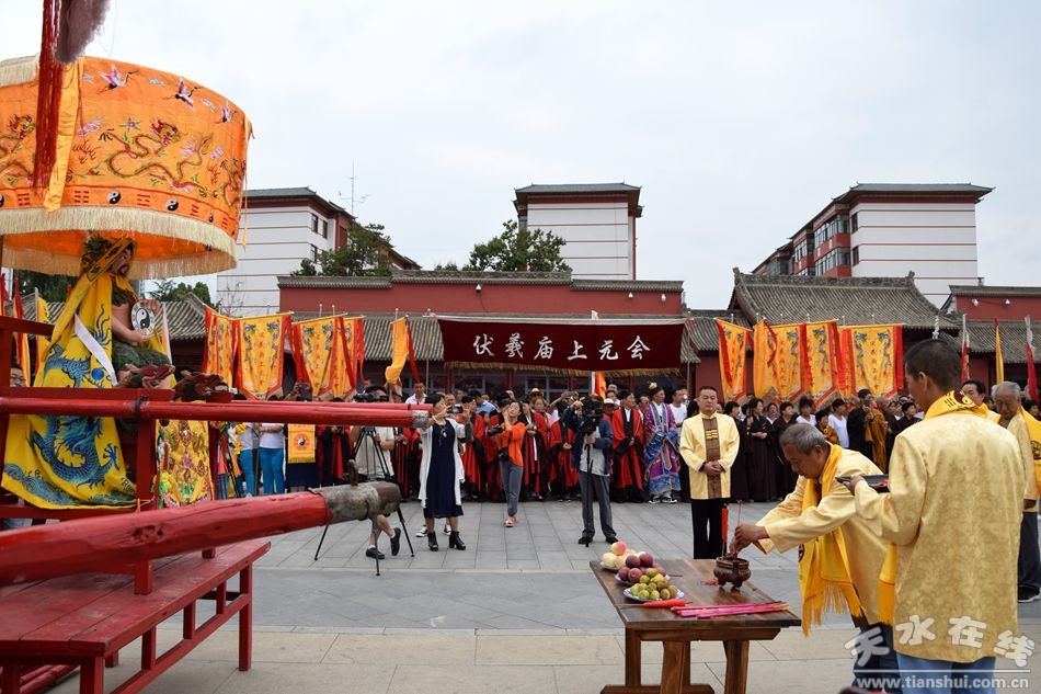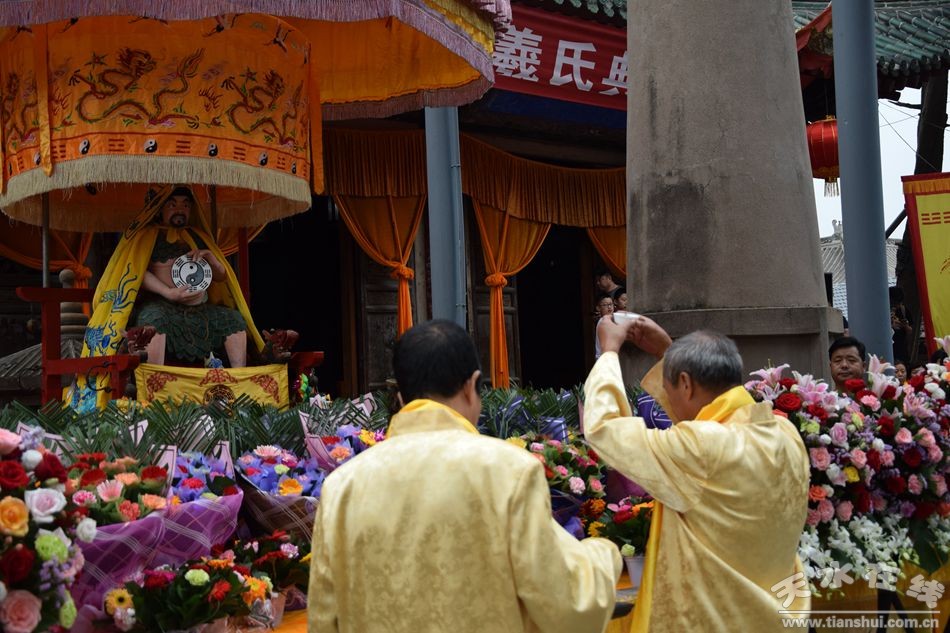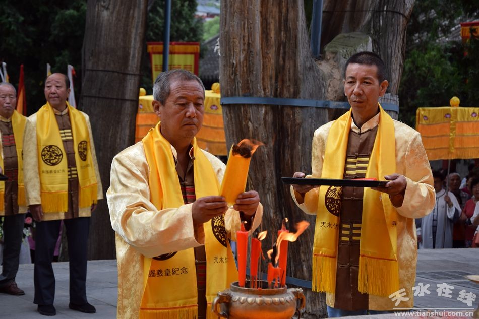 當(dāng)天的儀式主要有:恭請黑爺像進(jìn)伏羲廟,護(hù)駕伏羲行像出伏羲廟巡城;在伏羲大門對面的戲樓前舉行出榜文儀式;伏羲行像和方神黑爺像,繞行東門巡游后進(jìn)入伏羲祭祀廣場中央,面朝北方設(shè)香案舉行請神儀式,主祭人面向正南行禮恭迎伏羲神位,明燭、上香、奠酒、獻(xiàn)茶、叩拜化表。主持人詠誦《迎神曲》。表演文體節(jié)目;伏羲行像與方神黑爺起駕進(jìn)伏羲廟,在先殿月臺(tái)舉行安神儀式,主祭人明燭、上香、化表、跪拜。安神儀式后,護(hù)送黑爺像,返回大門西側(cè)本宮。
