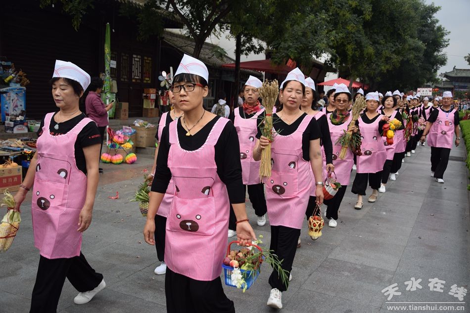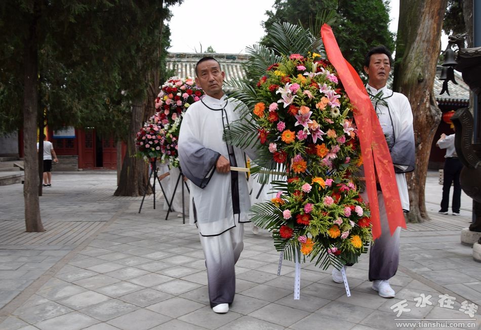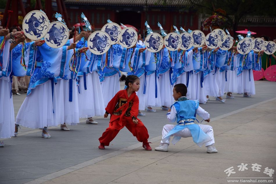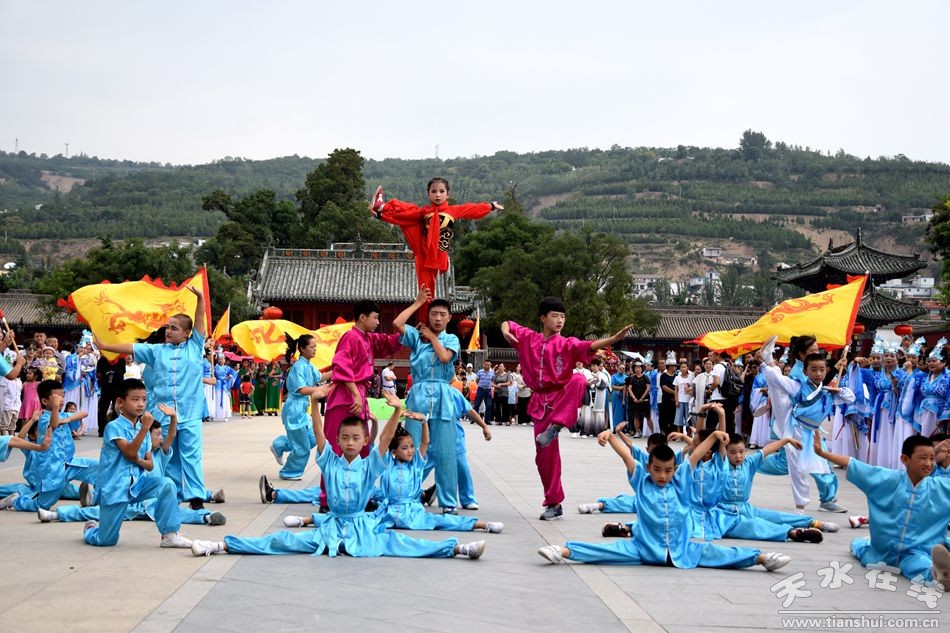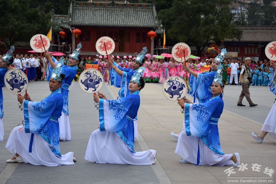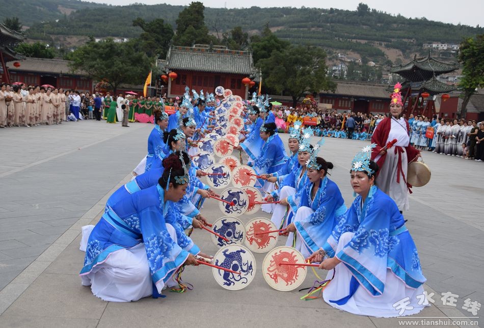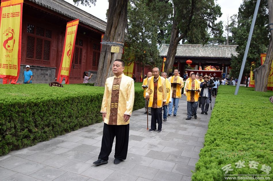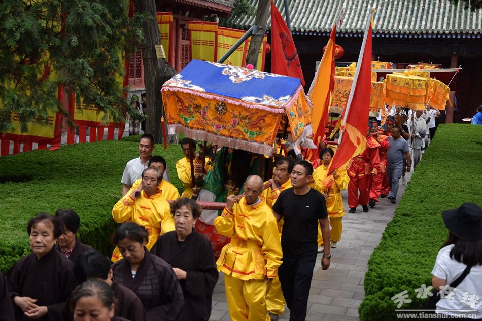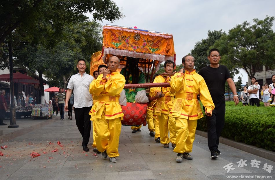 當(dāng)天的儀式主要有:恭請黑爺像進(jìn)伏羲廟,護(hù)駕伏羲行像出伏羲廟巡城;在伏羲大門對面的戲樓前舉行出榜文儀式;伏羲行像和方神黑爺像,繞行東門巡游后進(jìn)入伏羲祭祀廣場中央,面朝北方設(shè)香案舉行請神儀式,主祭人面向正南行禮恭迎伏羲神位,明燭、上香、奠酒、獻(xiàn)茶、叩拜化表。主持人詠誦《迎神曲》。表演文體節(jié)目;伏羲行像與方神黑爺起駕進(jìn)伏羲廟,在先殿月臺(tái)舉行安神儀式,主祭人明燭、上香、化表、跪拜。安神儀式后,護(hù)送黑爺像,返回大門西側(cè)本宮。