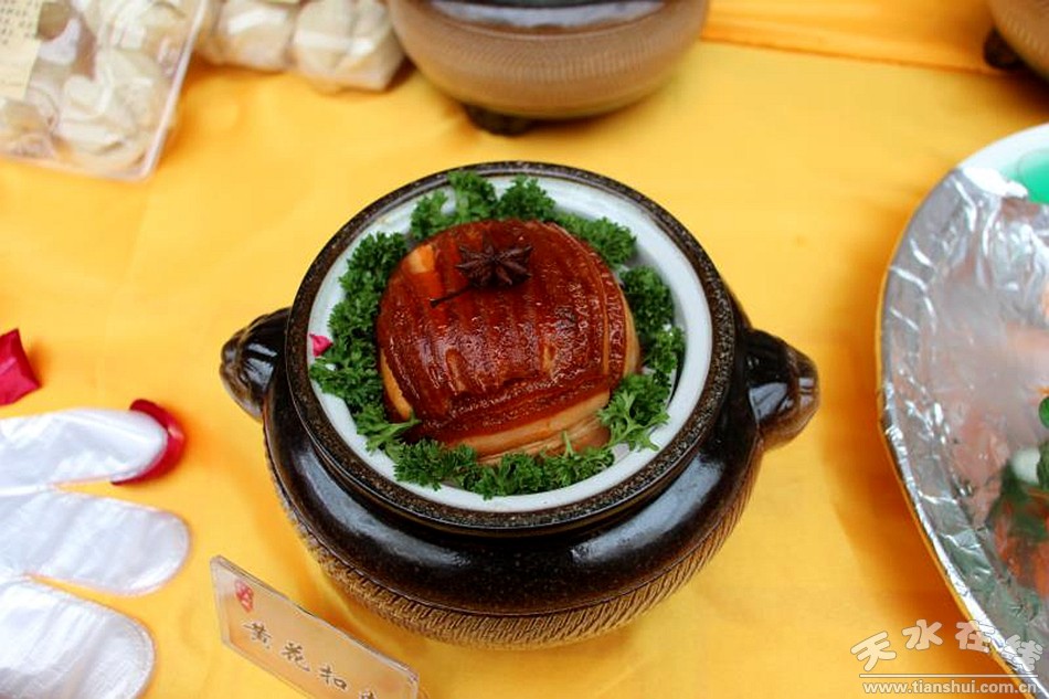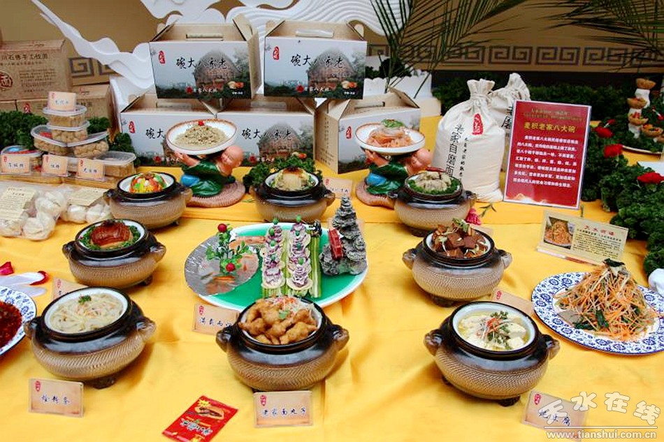 八大碗是天水農(nóng)村婚喪嫁娶,喜遷新居,滿月過壽及紅白事情時(shí)主人招待來賓的“席”。麥積老家八大碗是在傳統(tǒng)的基礎(chǔ)上做了改良,使八個(gè)碗子都獨(dú)具一格,不再重復(fù),匯聚了炸、燒、拌、醬、燴、燉、蒸等烹飪手法。使味型及菜品種類更加多元化,營養(yǎng)更加豐富,更加適應(yīng)和符合現(xiàn)代人的飲食習(xí)慣和養(yǎng)生理念!