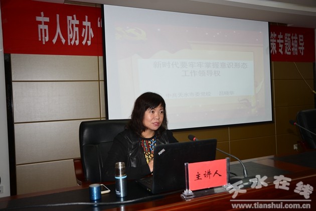 9月19日下午,根據(jù)天水市人防辦“不忘初心、牢記使命”主題教育計(jì)劃安排,市人防辦邀請(qǐng)市委宣講團(tuán)成員、市委黨?萍寂c文化教研室主任、甘肅省社會(huì)科學(xué)院天水分院文化旅游研究所所長(zhǎng)、副教授呂曉華,以“新時(shí)代要牢牢把握意識(shí)形態(tài)工作領(lǐng)導(dǎo)權(quán)”為題進(jìn)行形勢(shì)政策專題輔導(dǎo)。市人防辦黨組成員、副主任王永弟主持,市人防辦全體干部職工,結(jié)對(duì)共建的五里鋪社區(qū)宇航黨支部黨員干部參加了專題輔導(dǎo)。