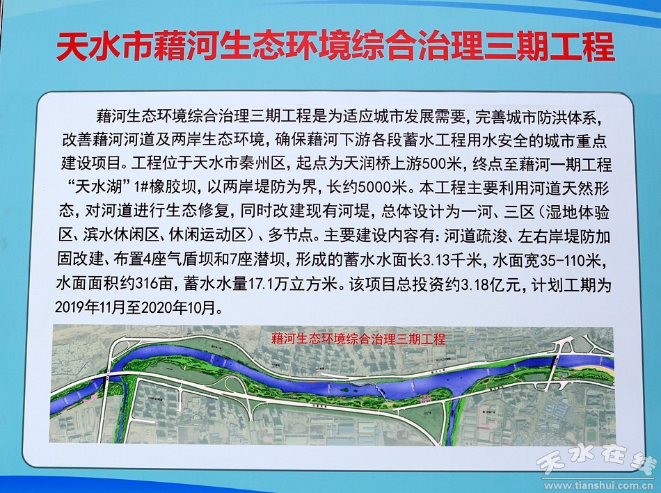 天水市藉河生態(tài)環(huán)境綜合治理三期項(xiàng)目是為適應(yīng)城市發(fā)展需要,完善城市防洪體系,改善藉河河道及兩岸生態(tài)環(huán)境,確保藉河下游各段蓄水工程用水安全的城市重點(diǎn)建設(shè)項(xiàng)目。工程位于天水市秦州區(qū),起點(diǎn)為天潤(rùn)橋上游500米,終點(diǎn)至藉河一期工程“天水湖”1#橡膠壩,以?xún)砂兜谭罏榻纾L(zhǎng)約5000米。本工程主要利用河道天然形態(tài),對(duì)河道進(jìn)行生態(tài)修復(fù),同時(shí)改建現(xiàn)有河堤,總體設(shè)計(jì)為一-河、三區(qū)(濕地體驗(yàn)區(qū)、濱水休閑區(qū)、休閑運(yùn)動(dòng)區(qū))、多節(jié)點(diǎn)。主要建設(shè)內(nèi)容有:河道疏浚、左右岸堤防加固改建、布置4座氣盾壩和7座潛壩,形成的蓄水水面長(zhǎng)3.13千米,水面寬35 -110米,水面面積約316畝,蓄水水量17.1萬(wàn)立方米。該項(xiàng)目總投資約3.18億元,計(jì)劃工期為2019年11月至2020年10月。