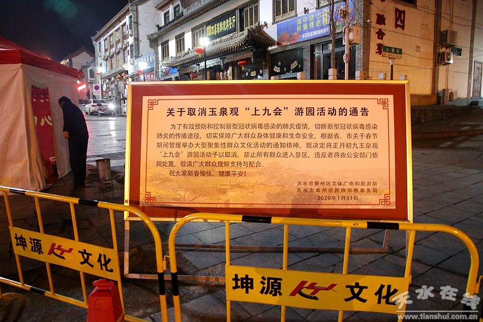 為了有效預(yù)防和控制新型冠狀病毒感染的肺炎疫情,切斷新型冠狀病毒感染肺炎的傳播途徑,切實(shí)保障廣大群眾身體健康和生命安全,天水市秦州區(qū)文體廣電和旅游局和天水市秦州區(qū)民族宗教事務(wù)局根據(jù)省、市關(guān)于春節(jié)期間暫緩舉辦大型聚集性群眾文化活動(dòng)的通知精神,決定將正月初九玉泉觀“上九會(huì)”游園活動(dòng)予以取消,禁止所有群眾進(jìn)入景區(qū)。