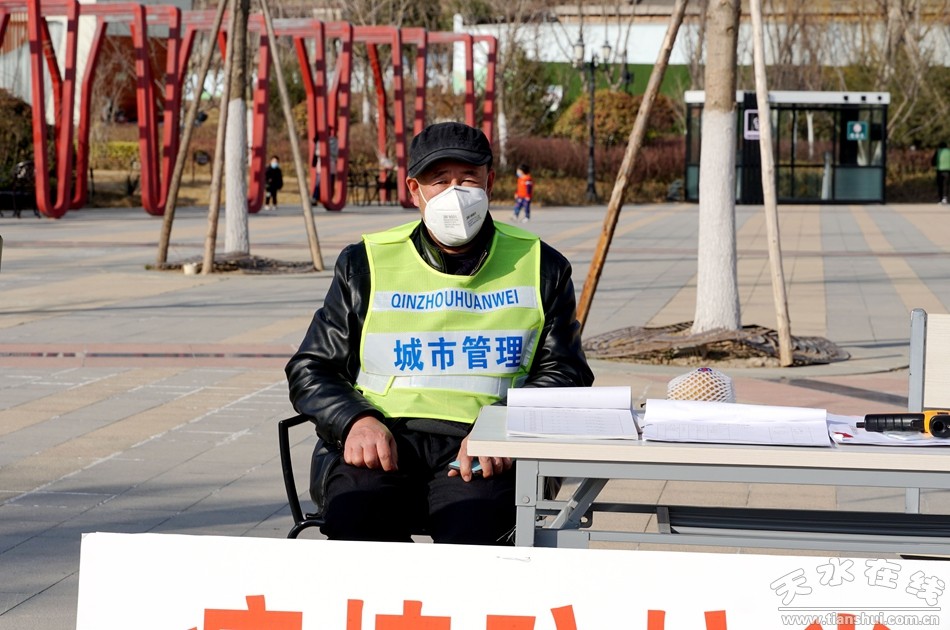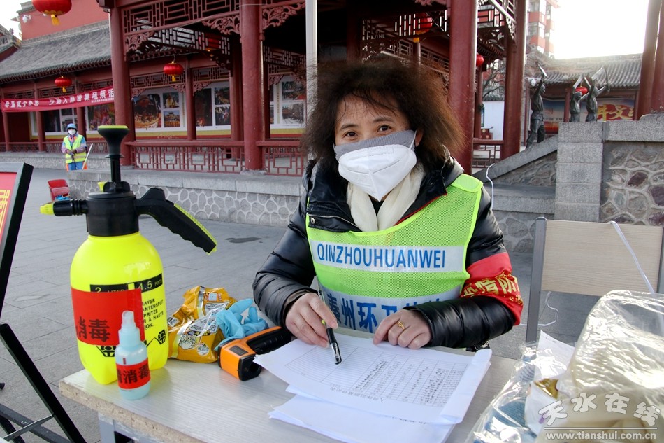 ▲伏羲廟廣場疫情防控宣傳點(diǎn):秦州區(qū)環(huán)衛(wèi)治理中心工作人員閆霞美