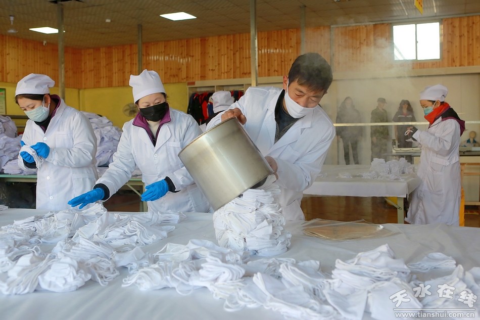 “車間正在加班點趕制口罩,從初六開始上班,我們準(zhǔn)備制作5萬個口罩,免費送給偏遠(yuǎn)山區(qū)奮戰(zhàn)在一線的防疫人員!彬v達(dá)實業(yè)有限責(zé)任公司董事長張維林說,他的公司在甘谷縣有26個扶貧車間,目前有4個車間已恢復(fù)生產(chǎn)。為了兼顧疫情防控和正常生產(chǎn),公司制定了一系列防控方案,包括員工每天進(jìn)廠前進(jìn)行消毒和測量體溫,并實行錯峰就餐。記者看到,生產(chǎn)車間工作人正在忙碌有序地作業(yè),每名工人都按照要求全部佩戴著口罩。