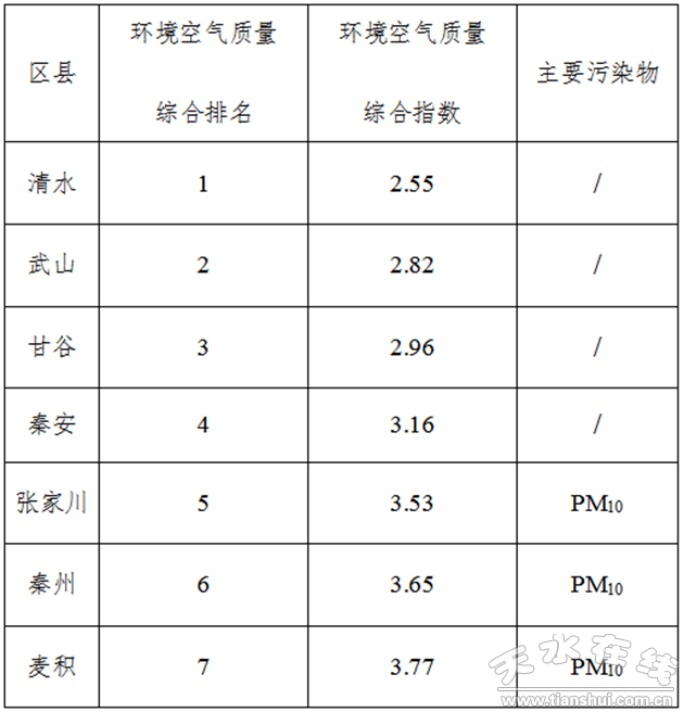 根據(jù)各縣區(qū)空氣質(zhì)量自動監(jiān)測數(shù)據(jù),剔除沙塵天氣影響后,2020年4月份各縣區(qū)環(huán)境空氣質(zhì)量綜合指數(shù)排名由低到高(空氣質(zhì)量由好到差)分別為:清水、武山、甘谷、秦安、張家川、秦州、麥積。