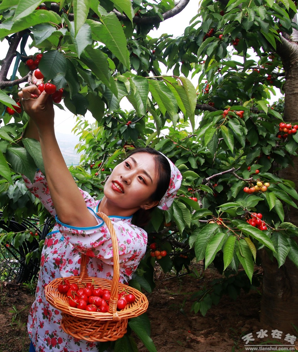 (圖為天水在線主播萌萌在煙鋪櫻桃園采摘櫻桃)