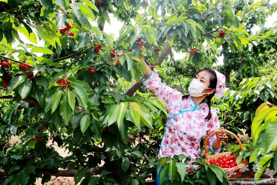 (圖為天水在線主播萌萌在煙鋪櫻桃園采摘櫻桃) |