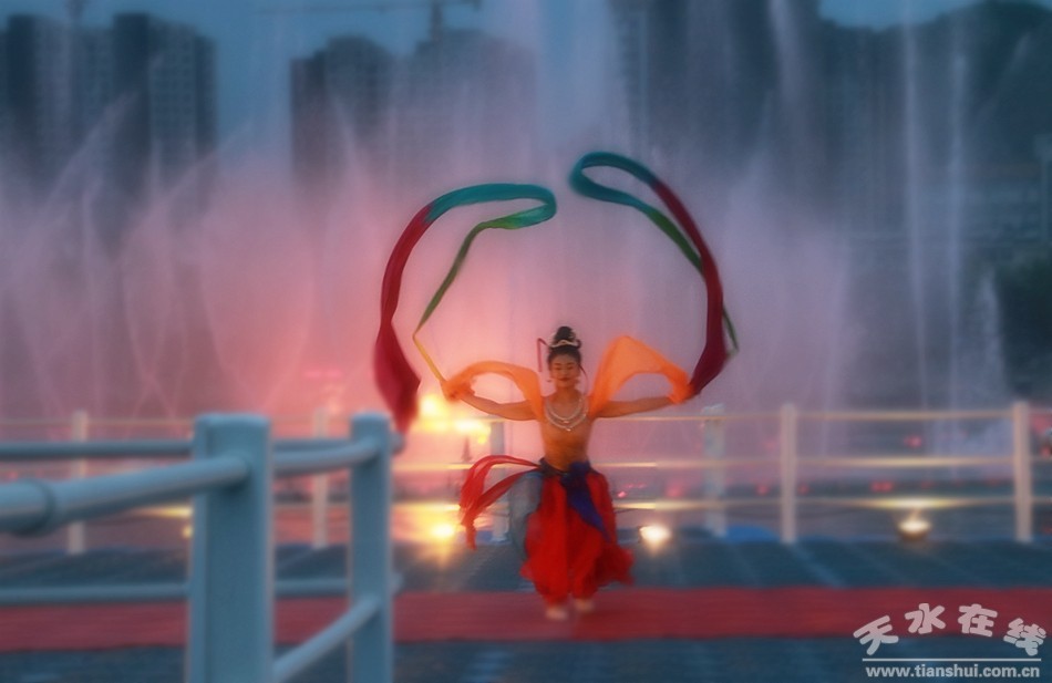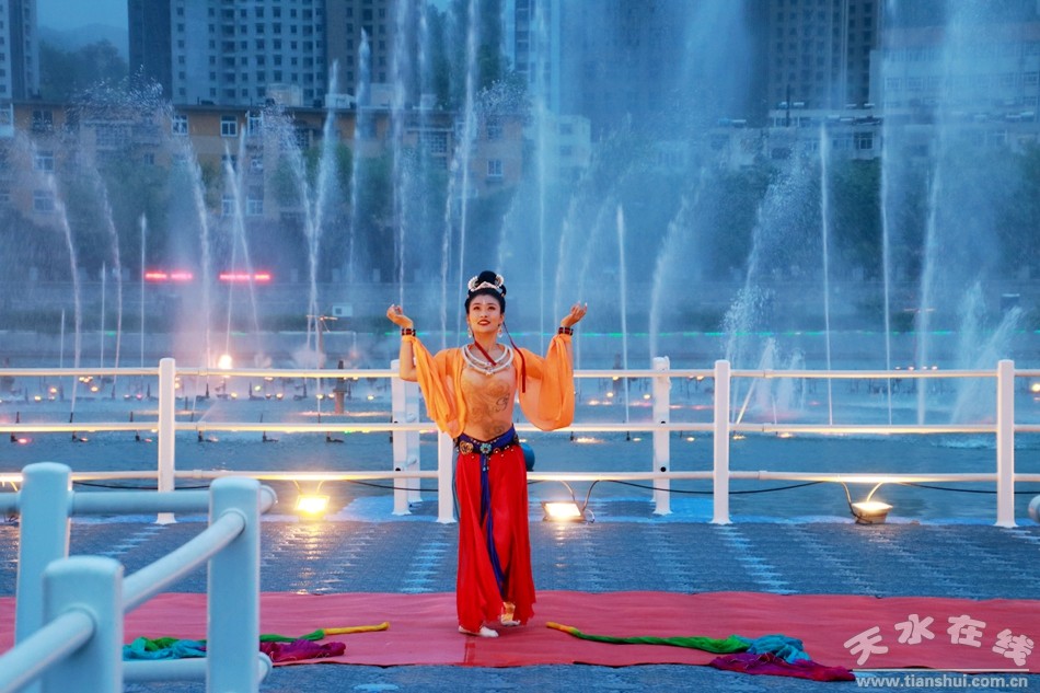 “麥積飛天”舞蹈,由天水在線邀請?zhí)焖懈栉鑸F王時飛導(dǎo)演根據(jù)麥積山石窟散花樓飛天壁畫和天女散花故事創(chuàng)編,由天水在線主播萌萌在天水湖“大美天水”音樂噴泉舞臺進行表演。