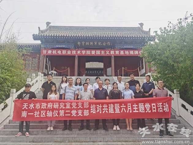 6月12日,天水市政府研究室黨支部與石馬坪街道南一社區(qū)軸儀第二黨支部開(kāi)展城市基層結(jié)對(duì)共建暨愛(ài)國(guó)主義教育活動(dòng)。市政府研究室副主任陳葆、李東林,市政府研究室黨支部全體黨員、石馬坪街道南一社區(qū)軸儀第二黨支部全體黨員參加活動(dòng)。全體黨員先后參觀學(xué)習(xí)了天水市人民防空辦公室黨建陣地、天水市人防宣傳教育體驗(yàn)館、愛(ài)國(guó)主義教育基地鄧寶珊將軍紀(jì)念館。