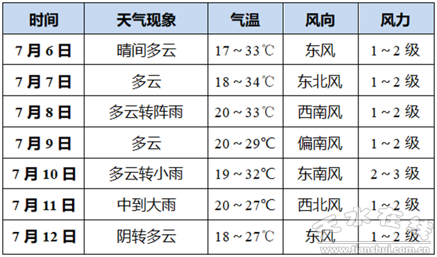 預(yù)計未來一周我市有兩次降水天氣過程,8日夜間陣雨,10~11日中到大雨,周內(nèi)氣溫起伏較大。