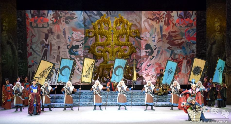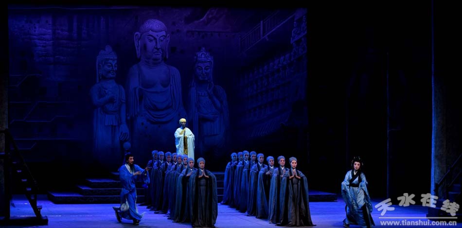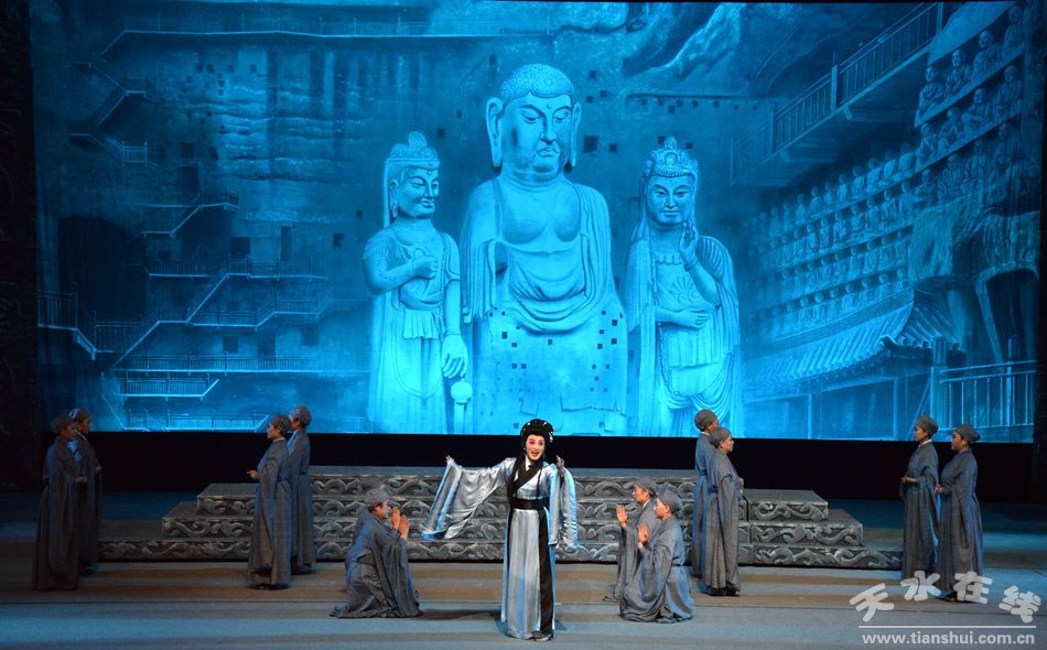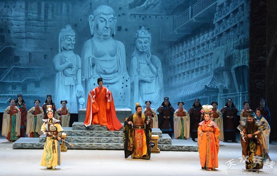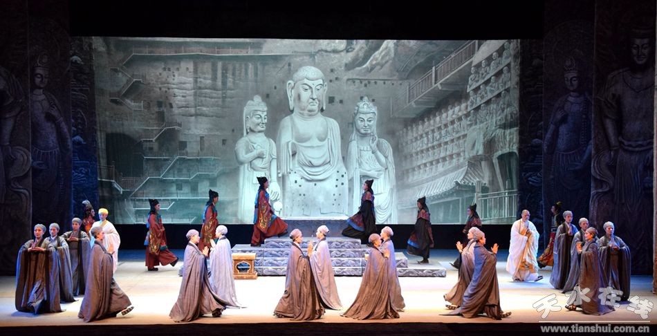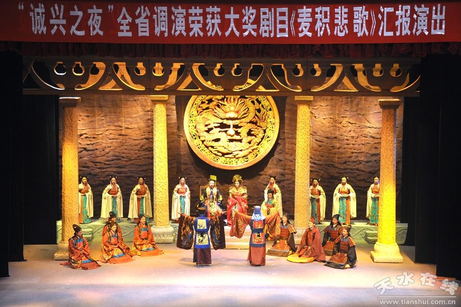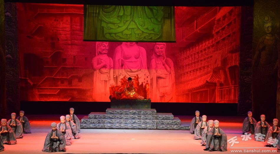 《麥積圣歌》原名為《麥積悲歌》,由天水市秦劇團(tuán)創(chuàng)排,于2009年9月27日舉行了首場公演,于2011年1月5日更名為《麥積圣歌》后首演。該劇以麥積山石窟44號窟龕乙弗氏為原型,用凄婉壯美的故事,塑造了一位集佛性之慈、人性之善、母性之美于一身的偉大女性形象;講述的是南北朝時(shí)期,東魏、西魏兩國爭相交好柔然國,以抗對方,西魏文帝元寶炬與柔然和親,在柔然公主和柔然大軍的逼迫下,先廢太子,再廢皇后;乙弗皇后一再退讓,初貶冷宮,進(jìn)而又遭柔然公主和宇文泰陷害,被遣麥積山兩次削發(fā)為尼,最終自焚而死的凄惋故事。